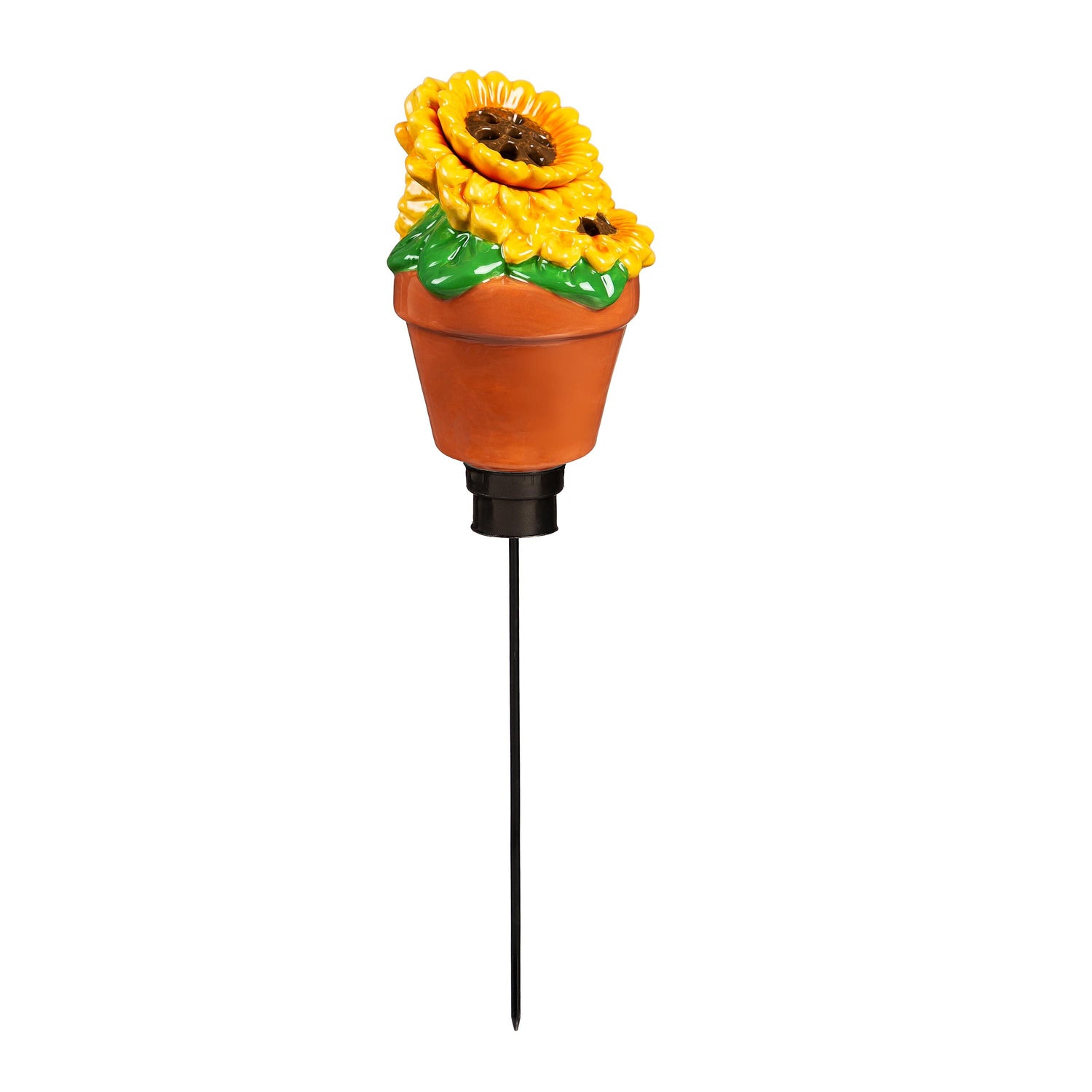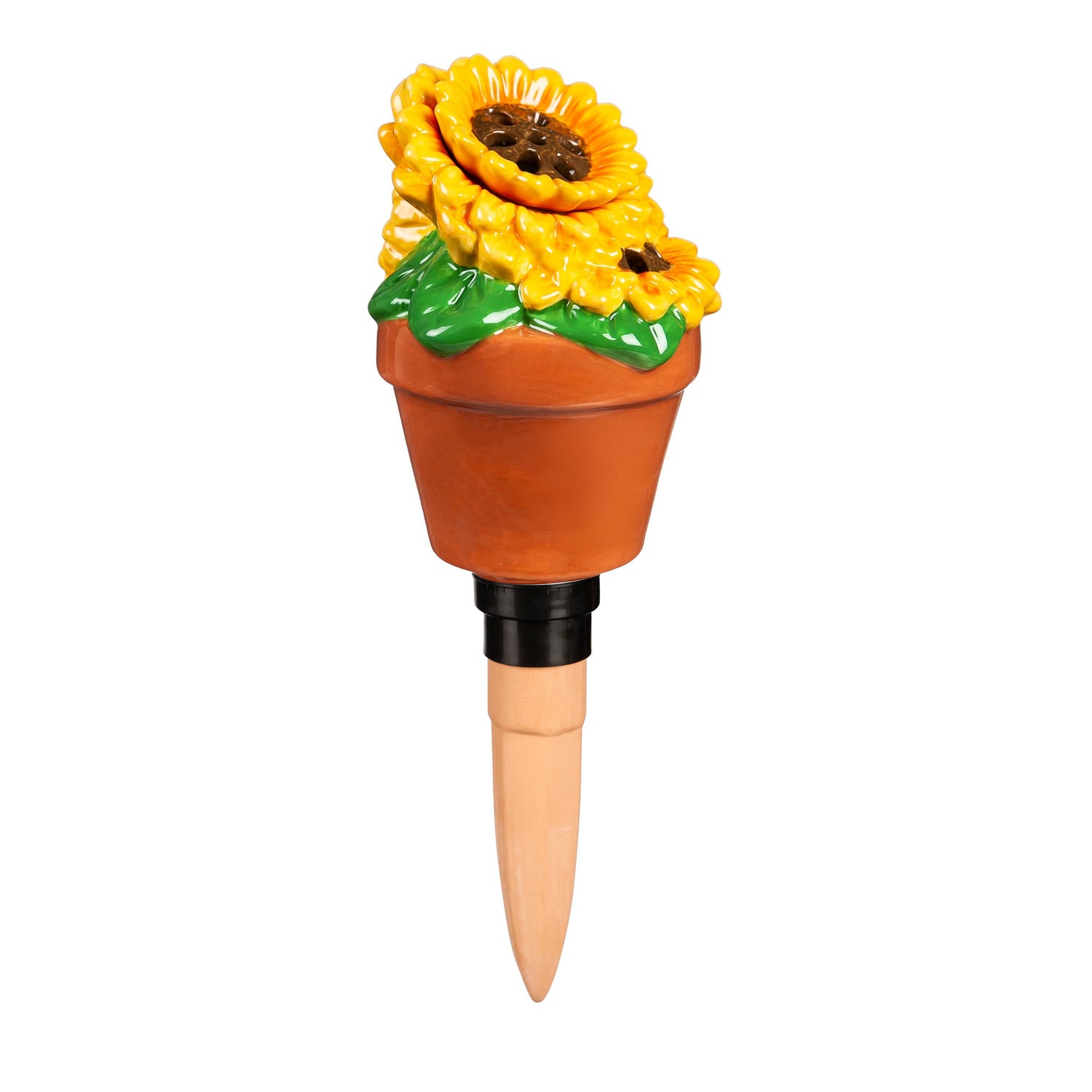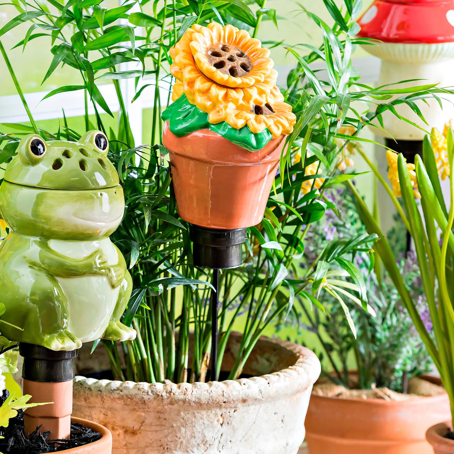 This all-in-one piece has two practical uses in whimsical designs! Coming in a sunflower, frog, gnome or mushroom style, it can be used as a watering globe and a fruit fly/gnat trap.