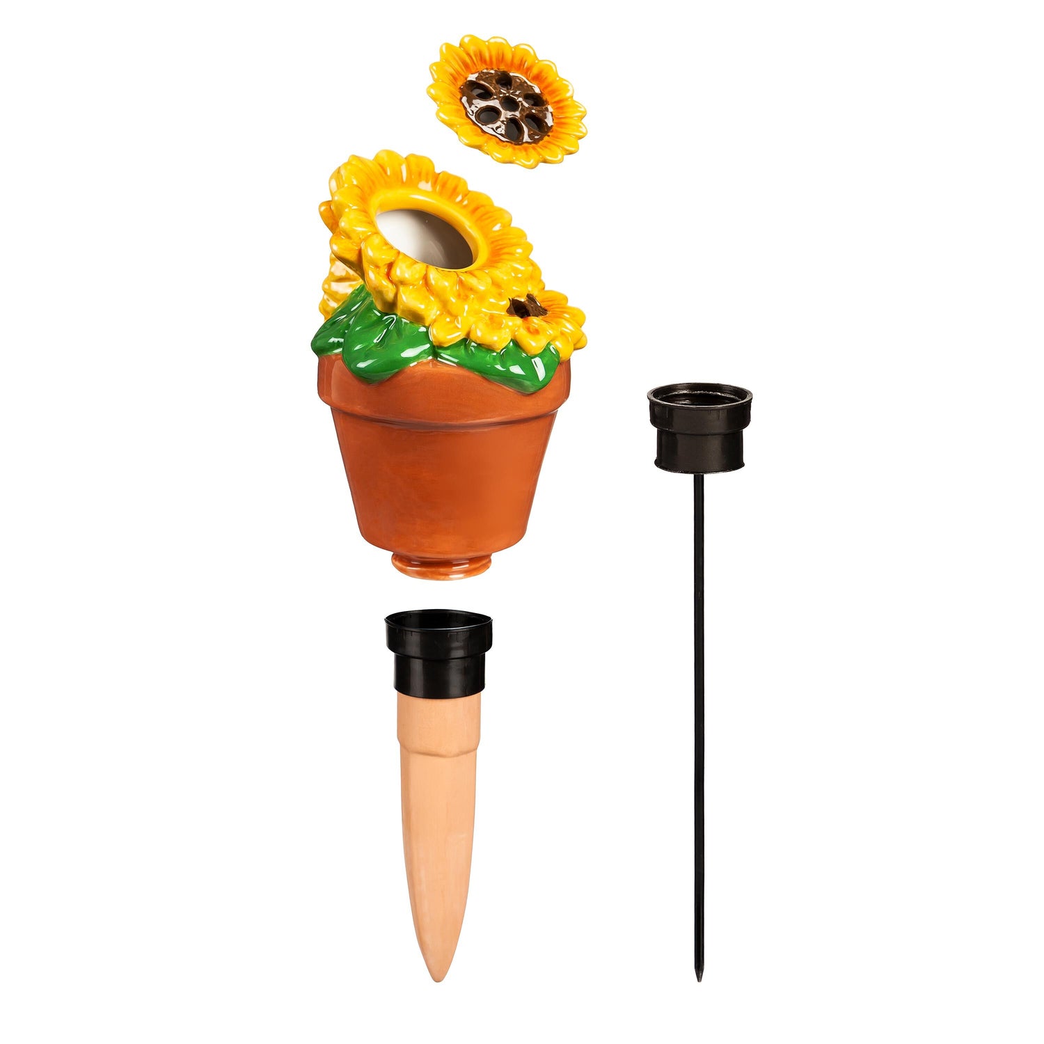 Crafted of ceramic with painted details, the decorative top can be filled with half a cup liquid bait (not included) to attract gnats and flies or filled with water when used as a watering globe. Simply swap out the metal stake with the terracotta spike.
