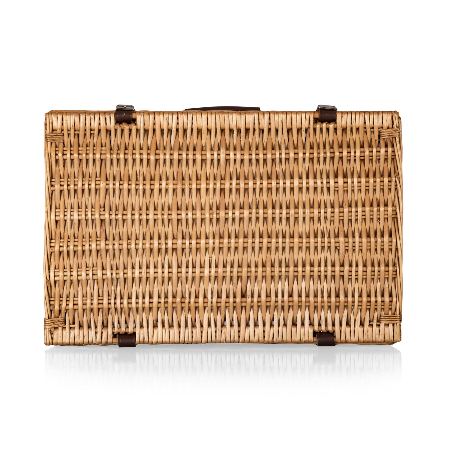Looking for a picnic basket and cooler combo in one that never sacrifices style? You've come to the right place. The Belmont Picnic Basket for 4 is a deluxe English picnic basket set loaded with full wine and cheese service for four and plenty of romantic vintage charm. Our willow wicker picnic basket features a durable lining, cooler section, plus a wine picnic set, alongside plates and silverware for 4 securely attached to the lid with leather straps and 4 wine glasses held in place in the body of the basket with elastic. And there’s still plenty of room for hot and cold foods, wine, cheese, charcuterie and more! With all of the necessary accessories for a perfect picnic, the Belmont picnic basket set is a classy and convenient wedding or anniversary gift for loving couples and families!