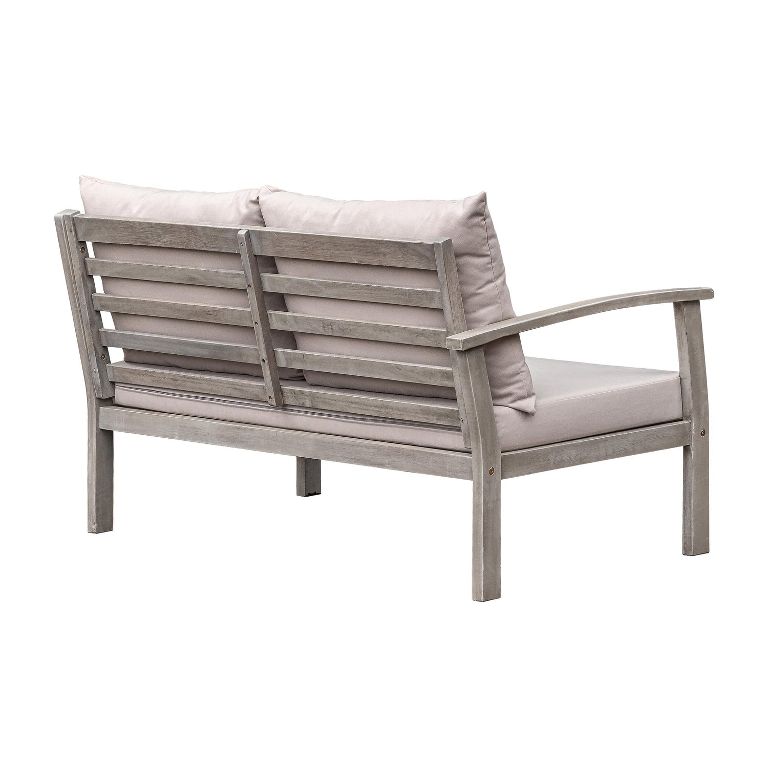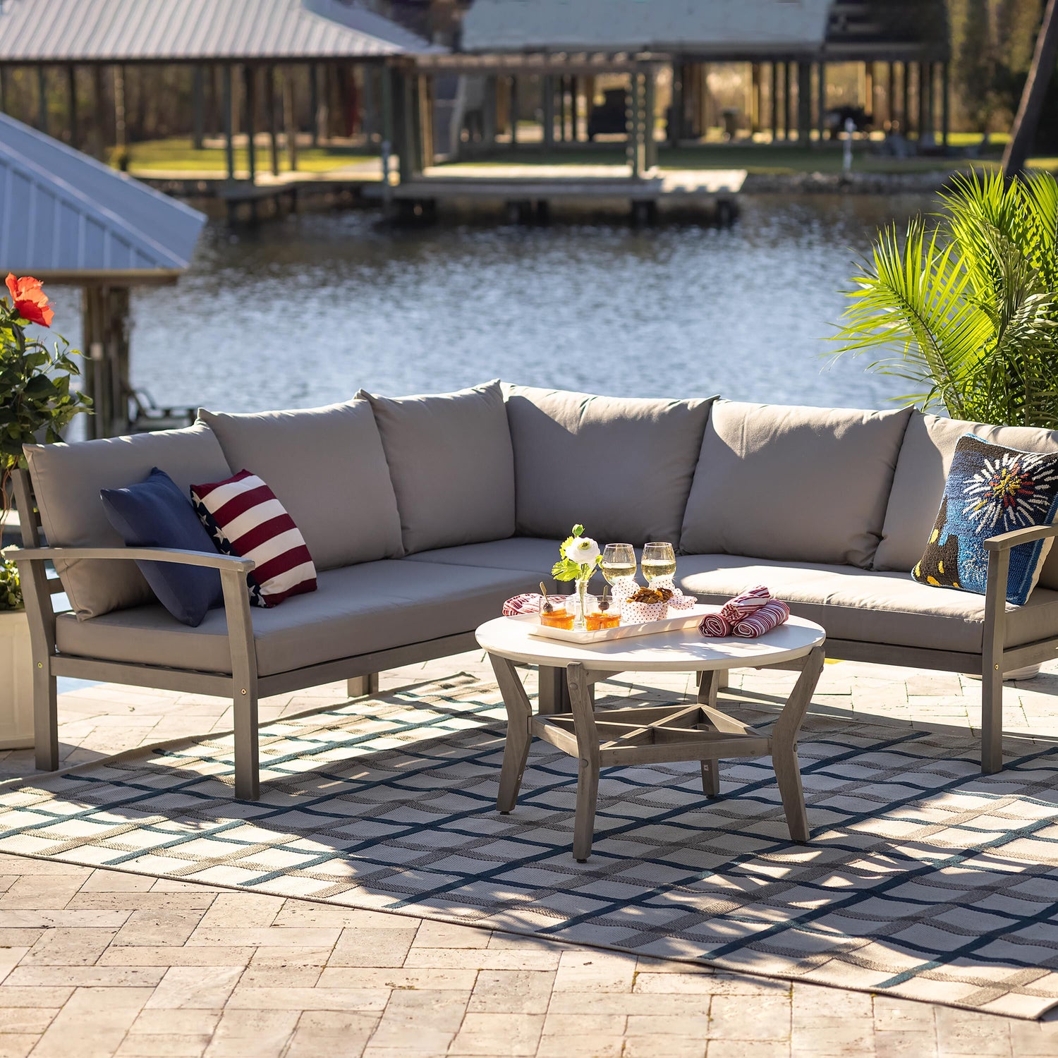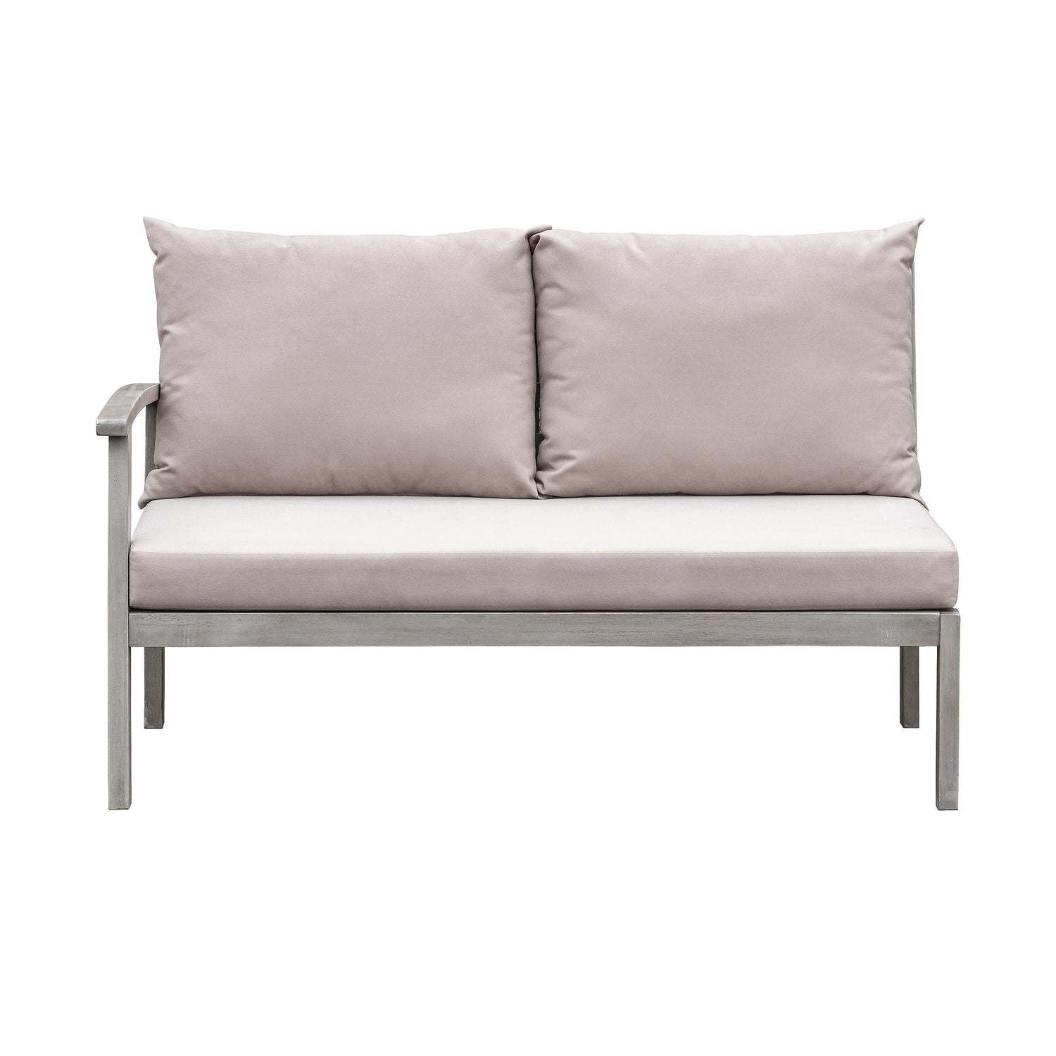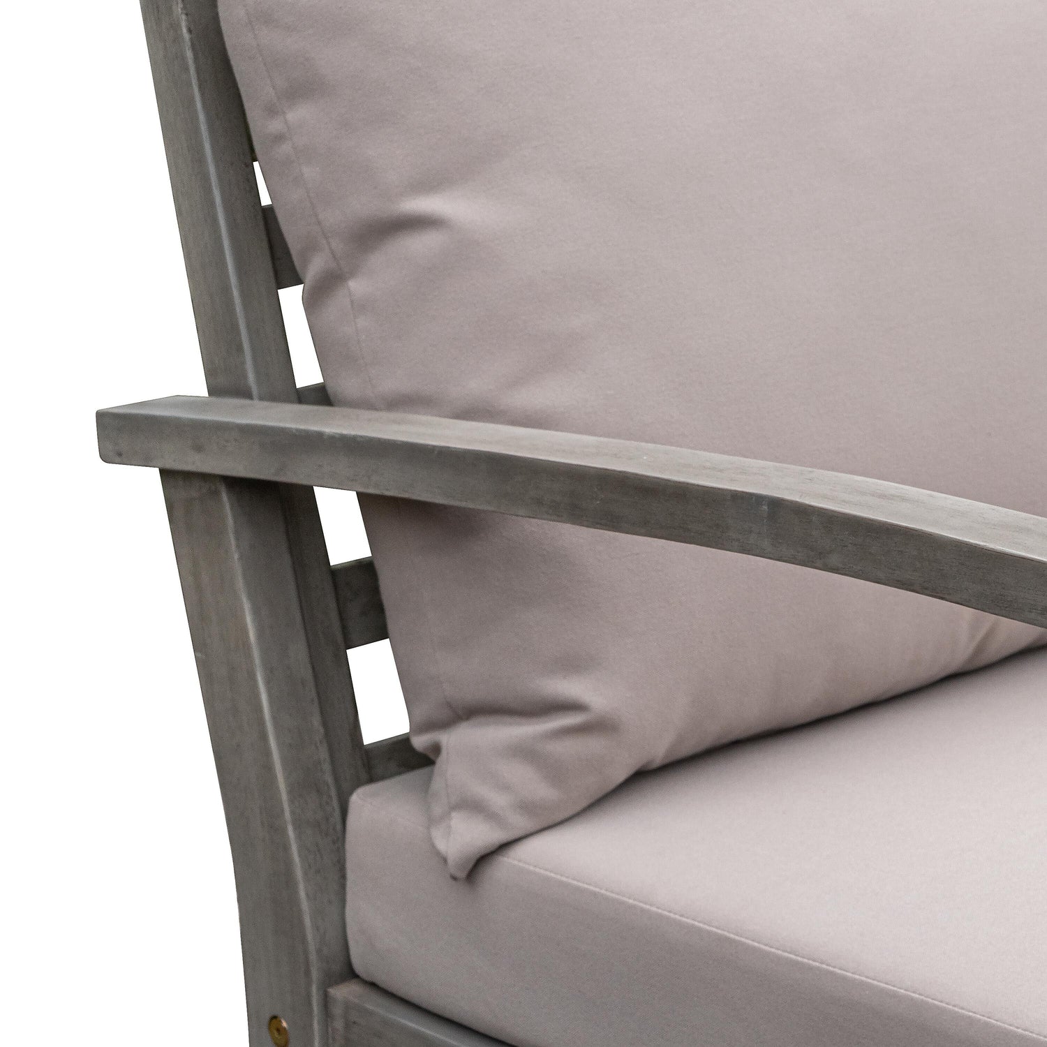 With its luxury construction and beautiful finish, this seating set makes a statement on deck, patio, or poolside. Generously seating 4-6, the set makes a wonderful place for days in the sun or evening gatherings under the stars. Sturdy Acacia wood frames have an on-trend gray driftwood tonal wash finish. Seat sections have slatted backs.