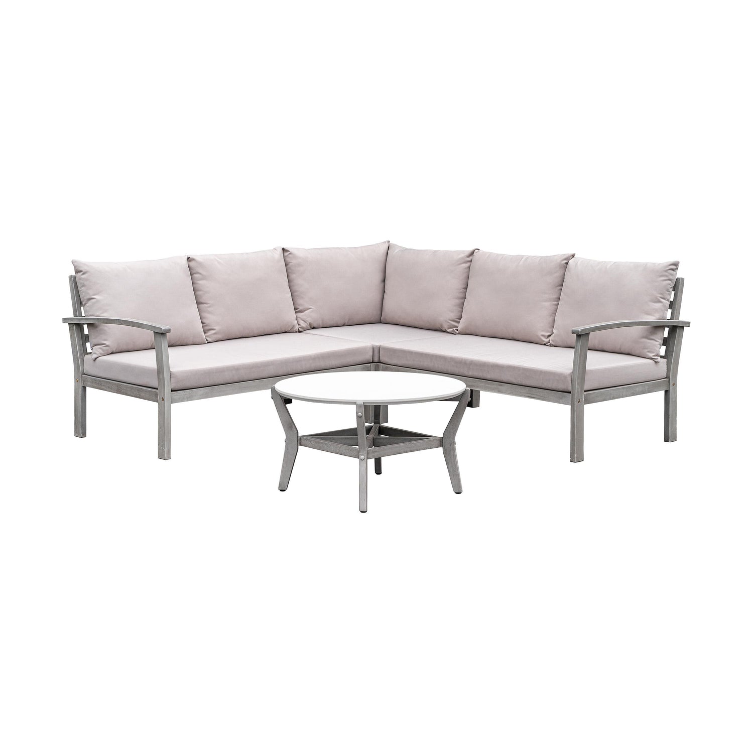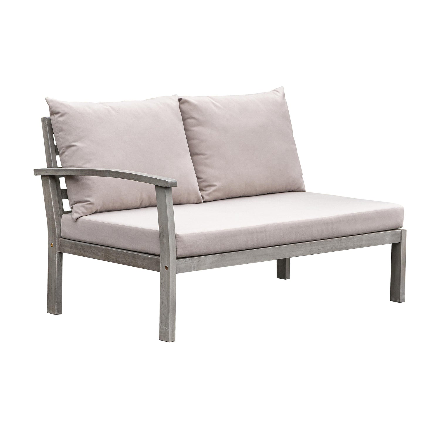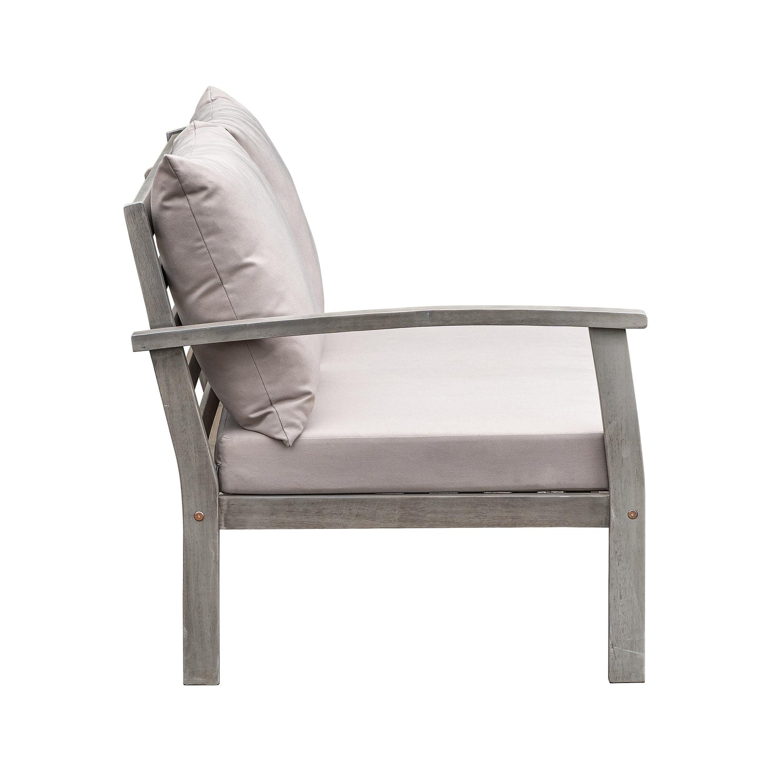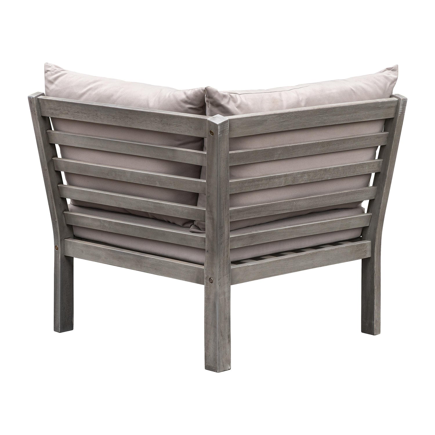 With its luxury construction and beautiful finish, this seating set makes a statement on deck, patio, or poolside. Generously seating 4-6, the set makes a wonderful place for days in the sun or evening gatherings under the stars. Sturdy Acacia wood frames have an on-trend gray driftwood tonal wash finish. Seat sections have slatted backs.