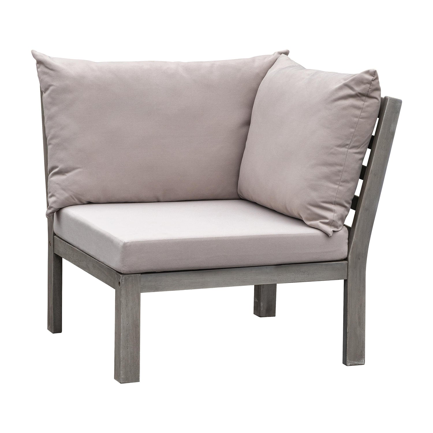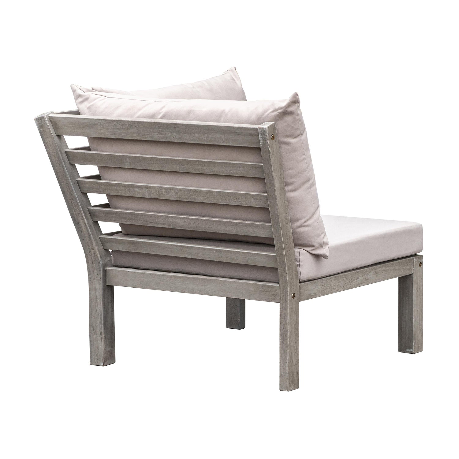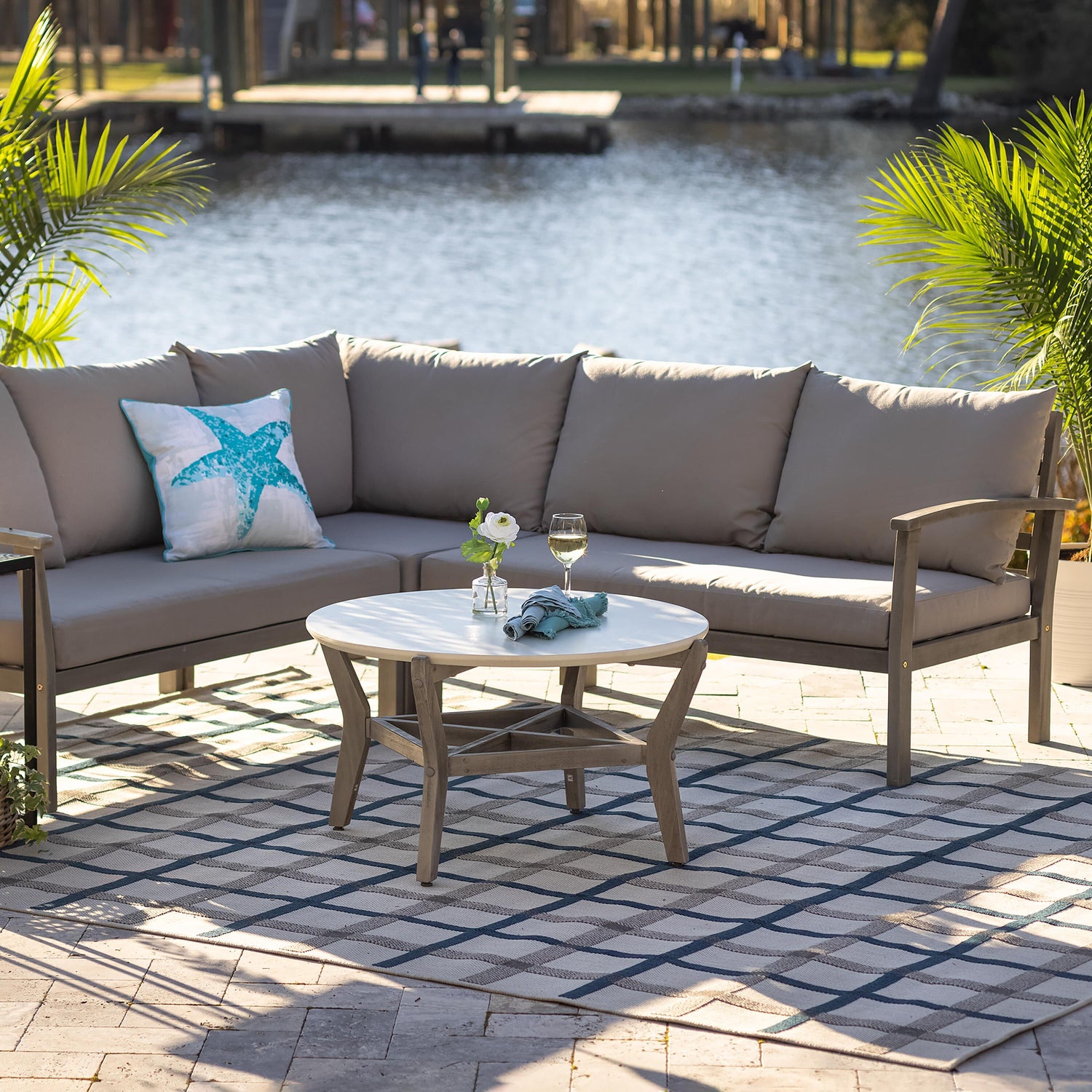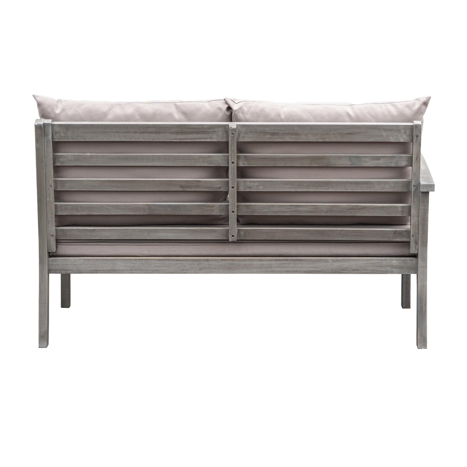 With its luxury construction and beautiful finish, this seating set makes a statement on deck, patio, or poolside. Generously seating 4-6, the set makes a wonderful place for days in the sun or evening gatherings under the stars. Sturdy Acacia wood frames have an on-trend gray driftwood tonal wash finish. Seat sections have slatted backs.