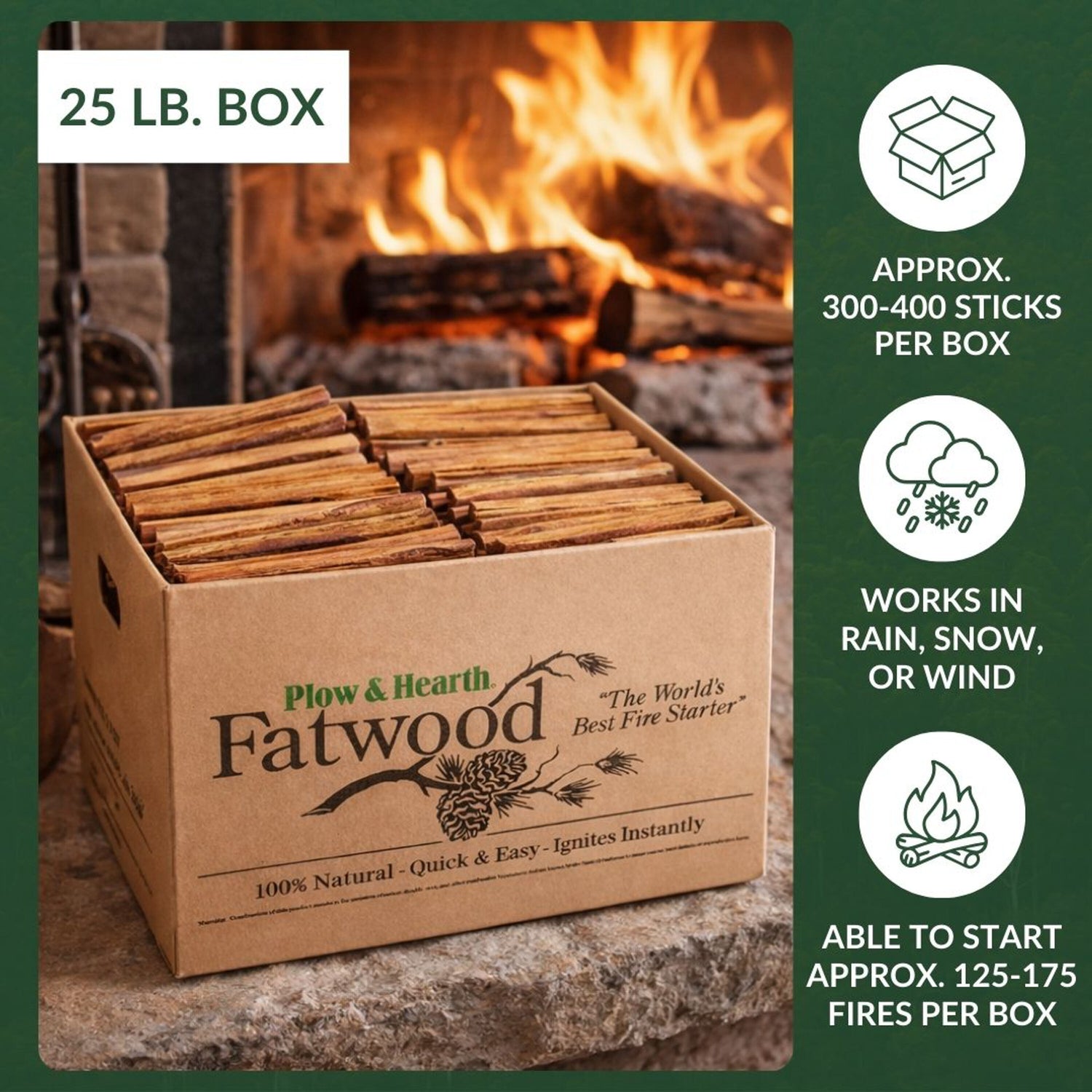 - Reliable Fatwood ignites instantly, burns at a high heat