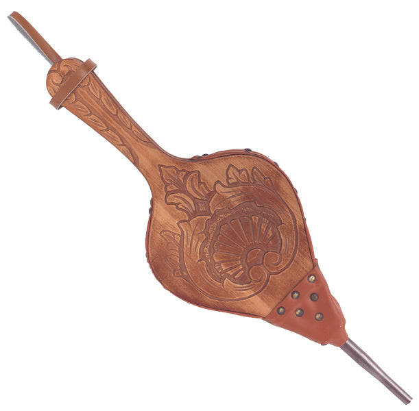 The hand-tooled design features an elegant floral and fan motif embossed into the mango wood, giving it timeless appeal. Whether you're stoking a roaring blaze or simply enjoying it as rustic décor, this bellows adds vintage charm and helps keep your fire burning bright.