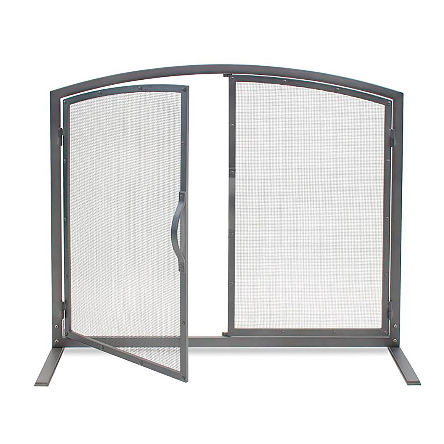 Sleek lines and a gently arched top make the Shadow Iron Door Fireplace Screen a stylish addition to your hearth, while the hinged doors make tending the fire easy and safe. Sturdy legs keep it stable even when the doors are fully open. Steel frame, mesh and legs are powder-coated in a natural iron finish for durability.