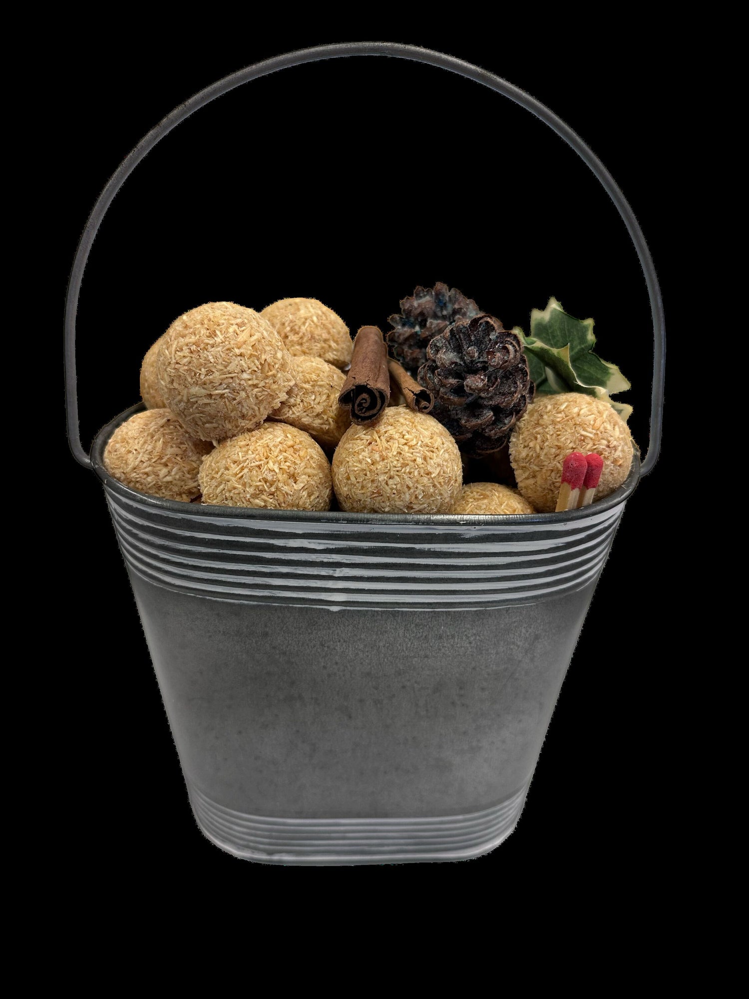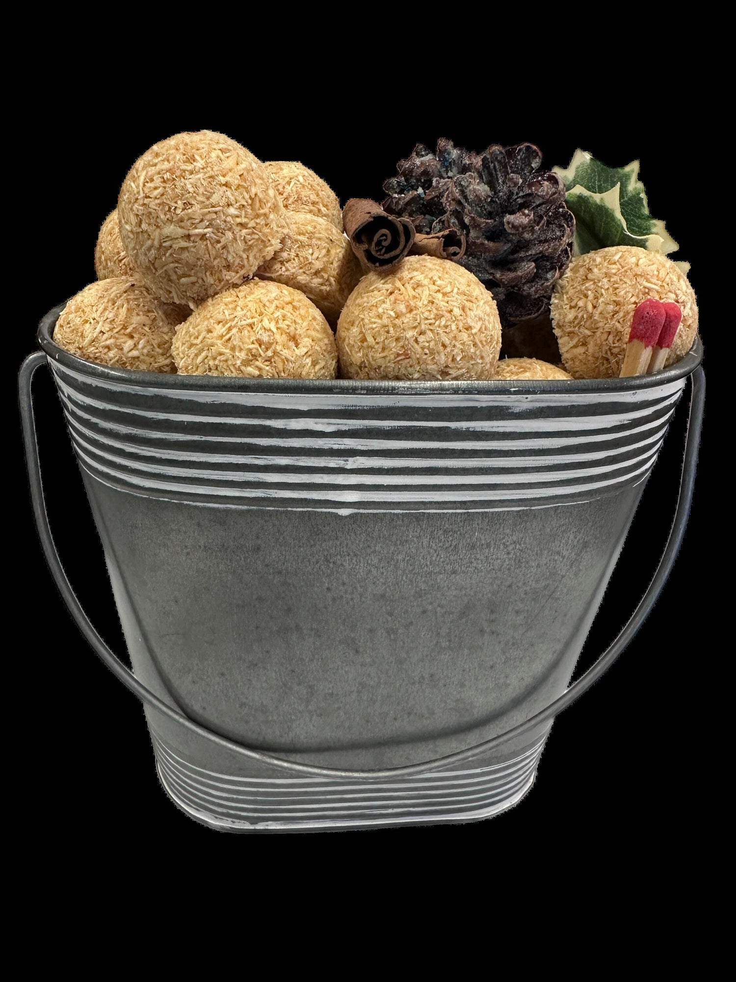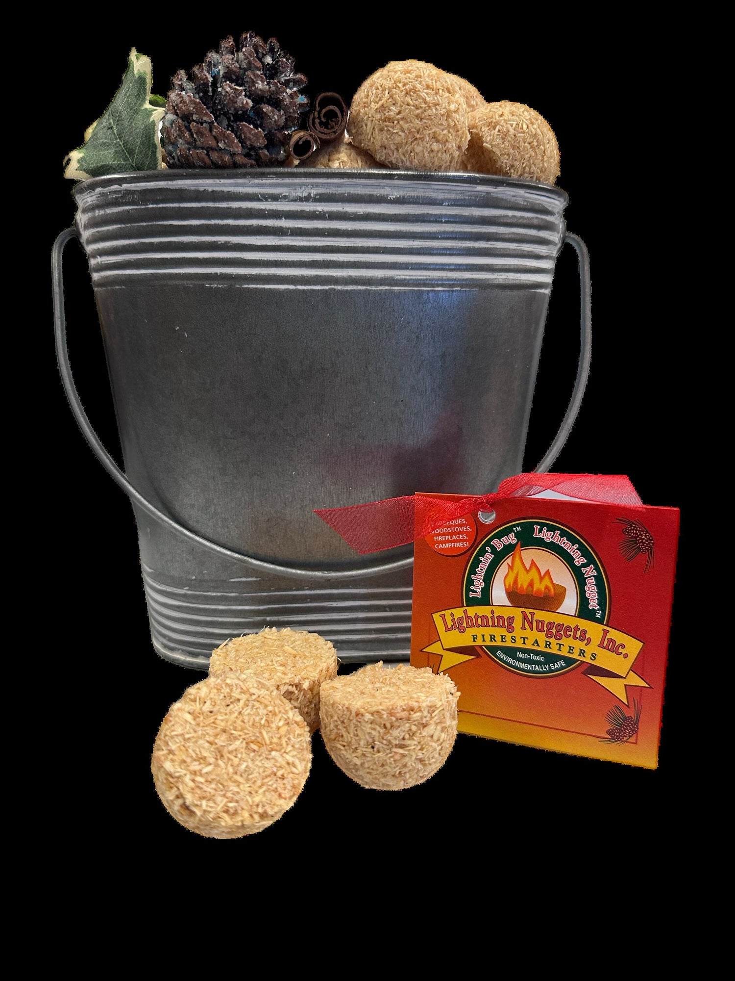 Packed in a galvanized metal bucket with decorative pinecones and greenery, this thoughtful set includes a box of Lightning Nuggets®, the all-natural firestarters trusted for clean, easy-burning fires. Made from renewable resources and wax-coated wood shavings, each nugget lights quickly with no mess, no flare-up, and no chemicals—just instant flame and long-lasting burn.