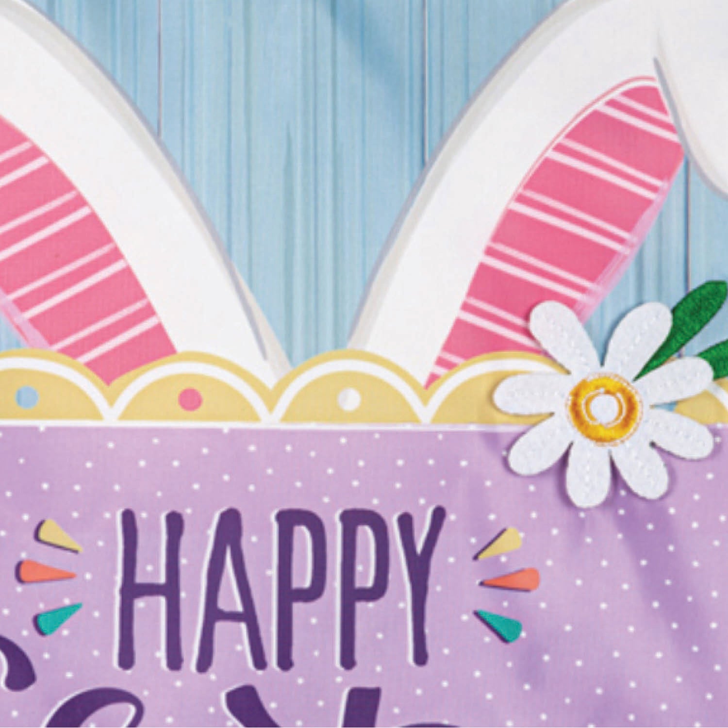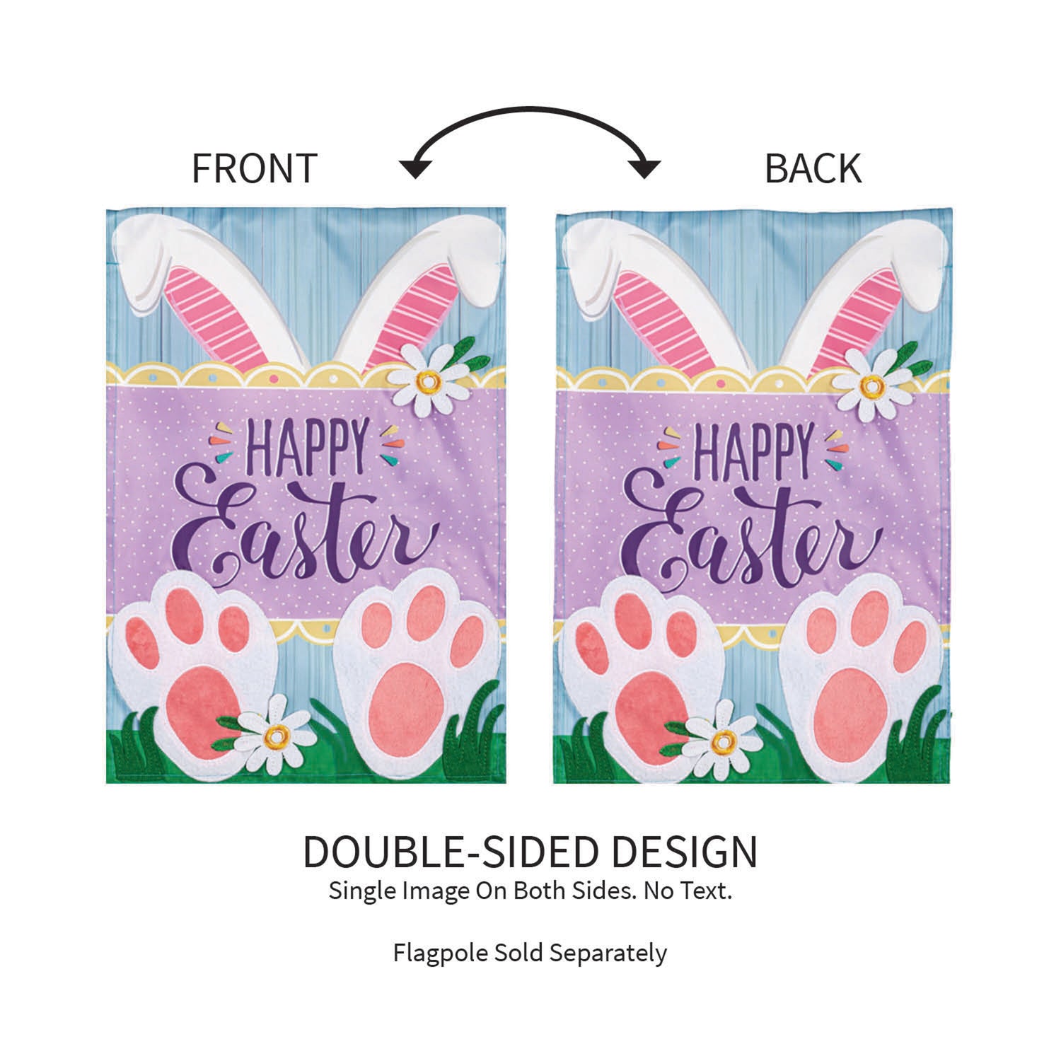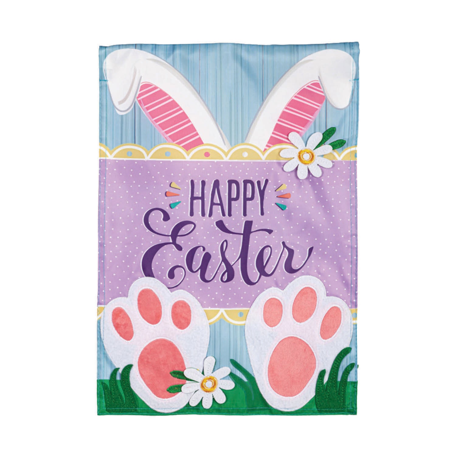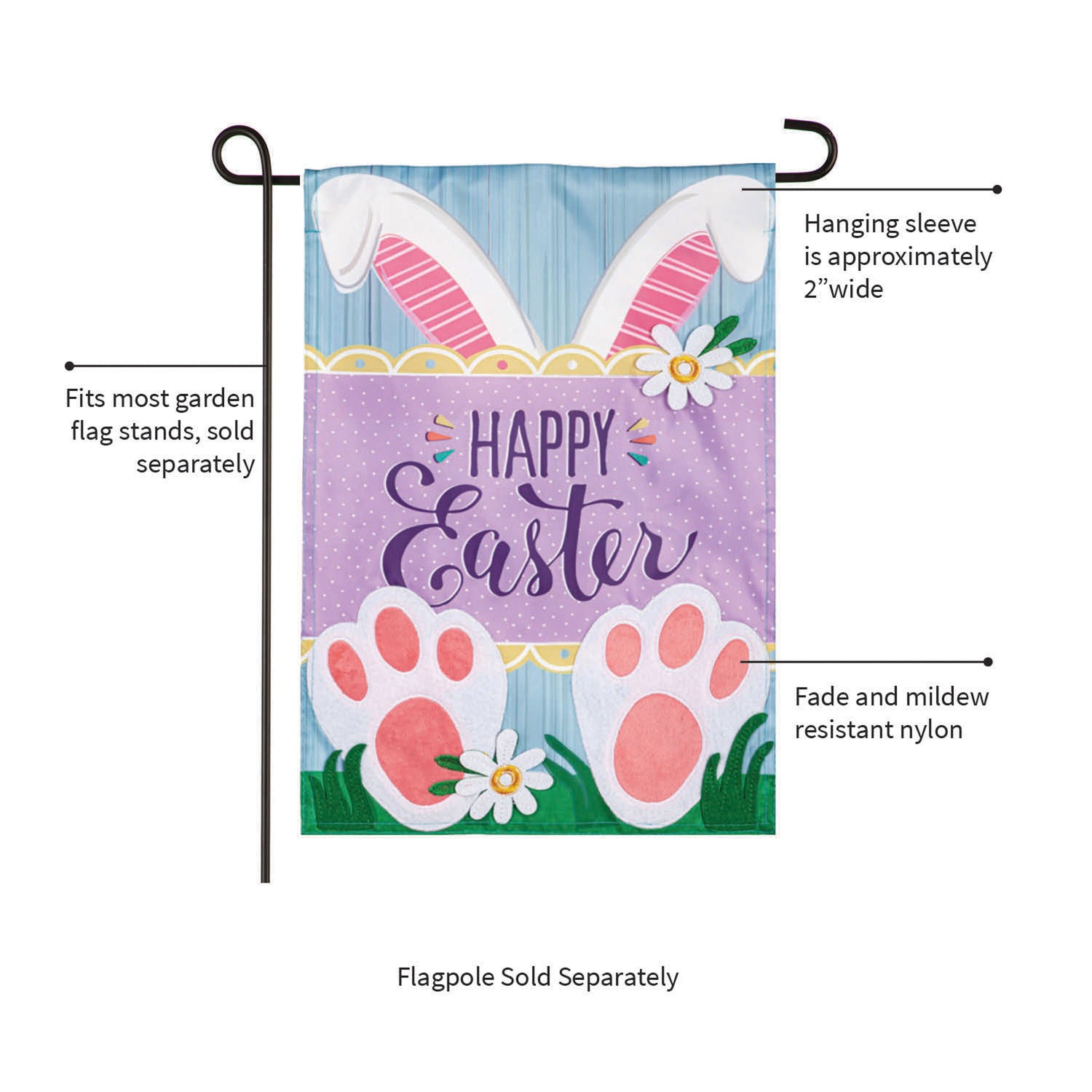Celebrate the season with this Garden Flag featuring sweet Easter bunny and a "Happy Easter" message. Each applique flag is carefully crafted from multiple layers of 310 denier nylon that can withstand a variety of weather conditions. We combine pieces of fade-resistant, strong fabric with tight, detailed stitching to create a dimensional mosaic effect. The soft yet heavyweight material illuminates beautifully in sunlight. Each flag features a sleeve that fits standard flagpoles or stands, sold separately. Due to the nature of the packaging, wrinkling may have occurred. Once item is unfolded and mounted on hardware, the creases will naturally fall out. Spot clean only. Never put in a dryer. When not in use, flags can be hung in a closet or placed in a storage container.