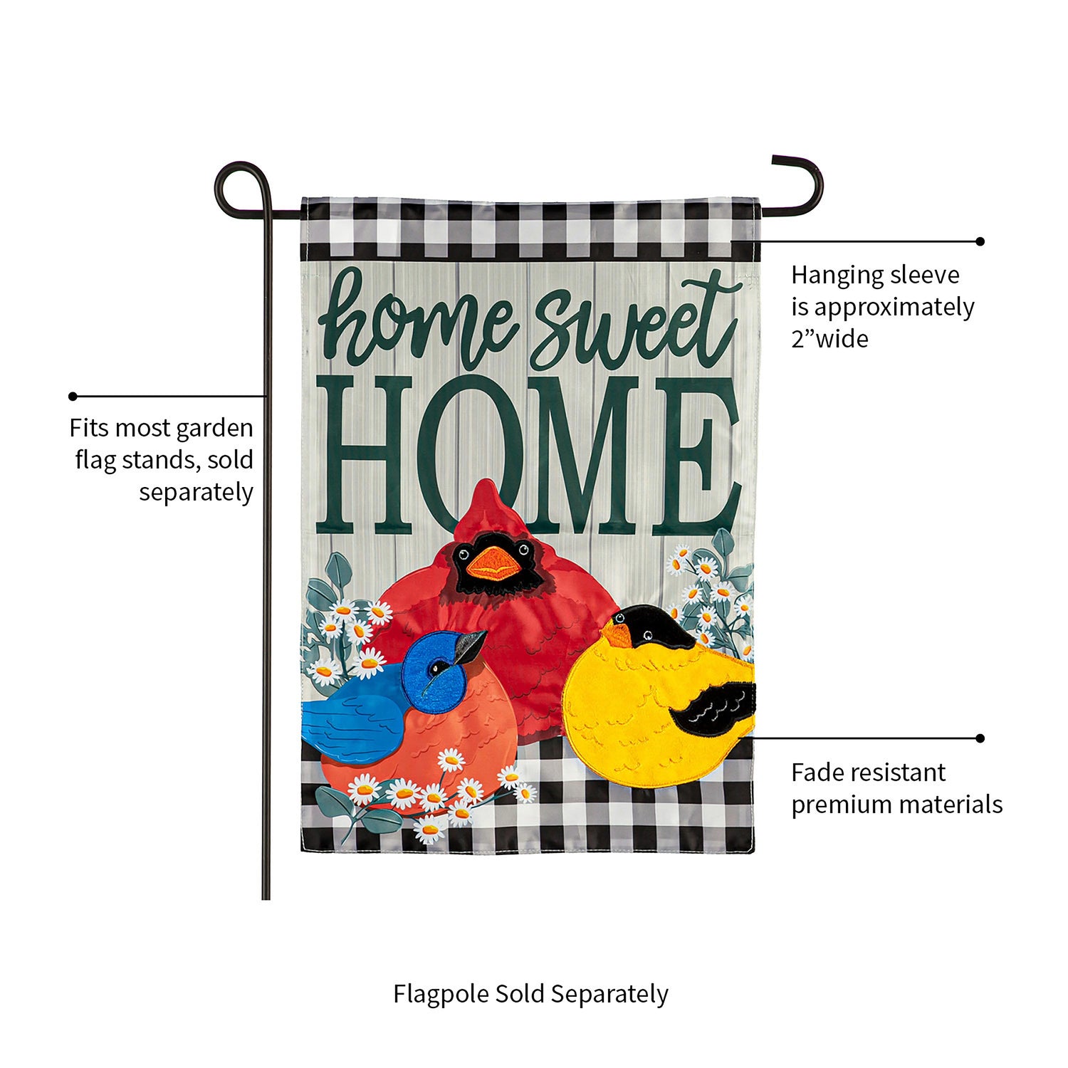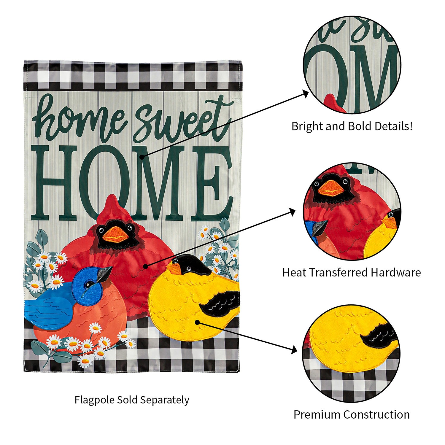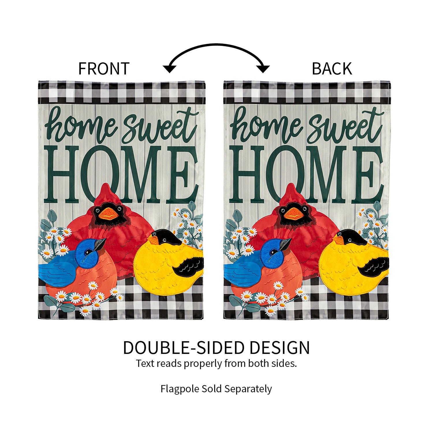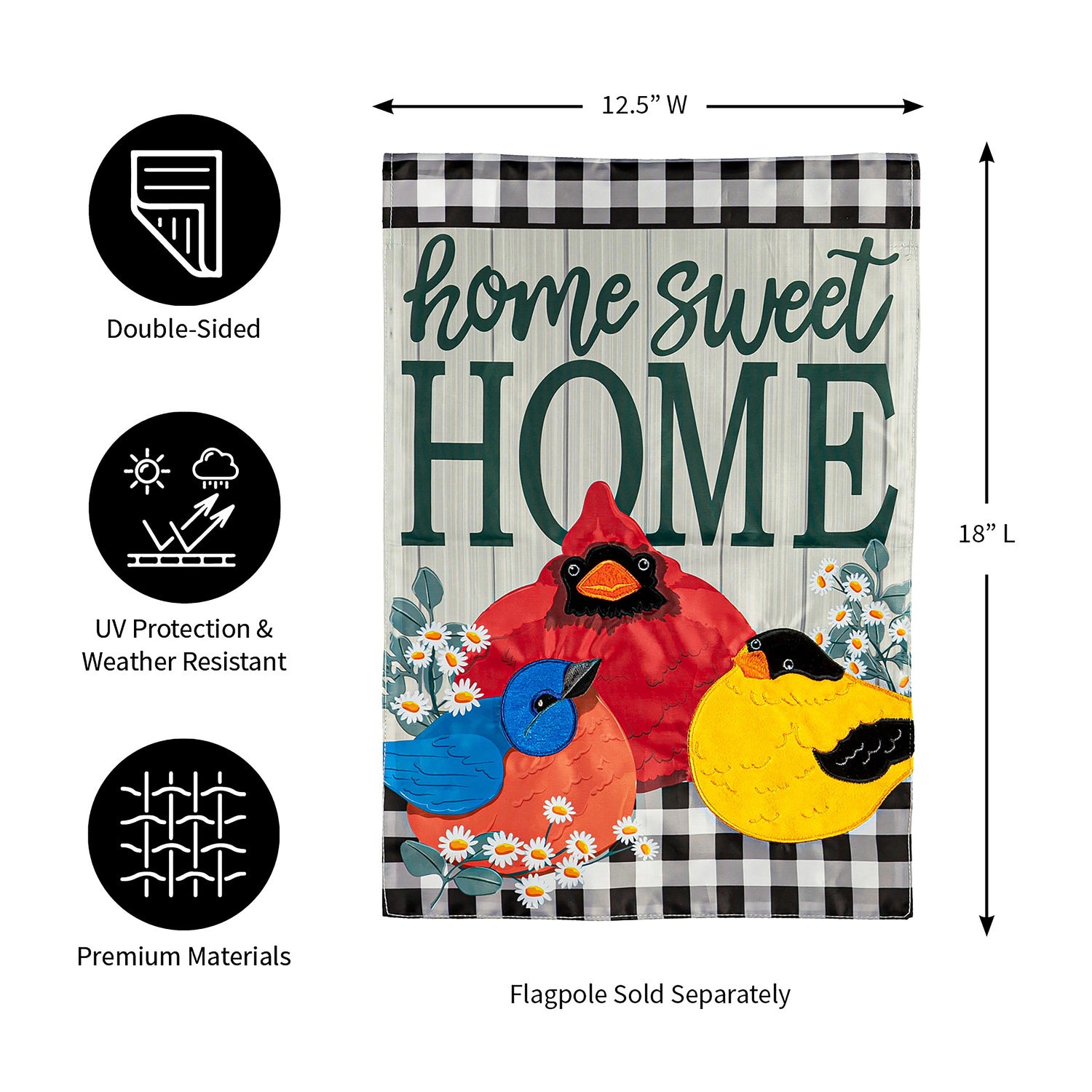 A trio of color, these portly songbirds offer a beautiful sight upon a classic buffalo check backdrop with a “Home Sweet Home” message on this garden flag.