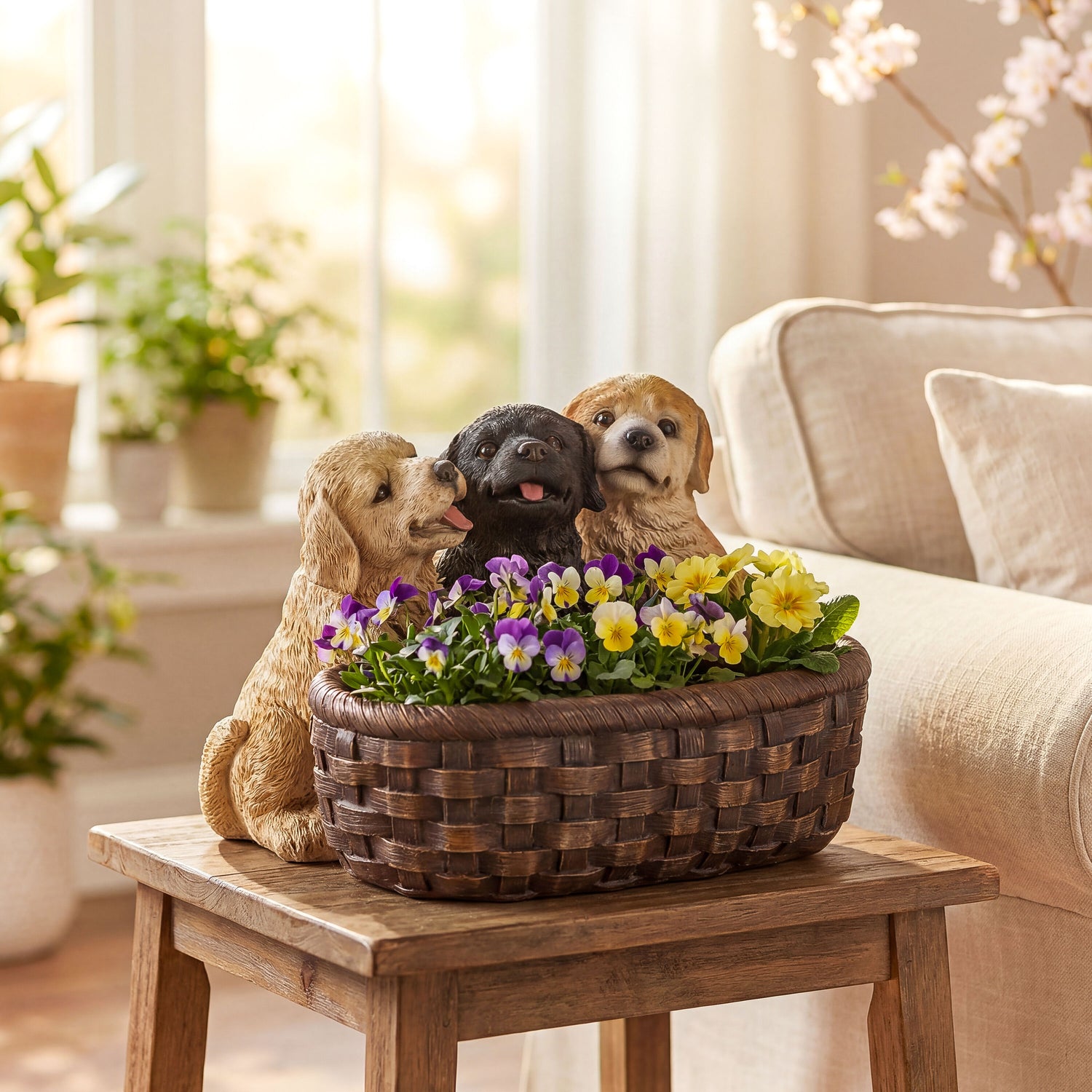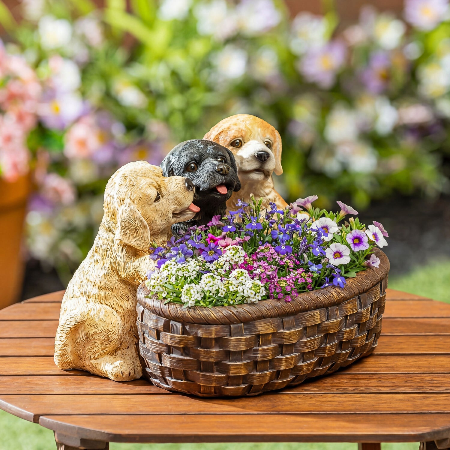 Add a dose of irresistible charm to your home or garden with our Puppies and Basket Planter, a heartwarming accent that celebrates the joy of man’s best friend. This adorable sculpture features three playful puppy pals; golden, black, and yellow, peeking out of a detailed woven-look basket. Each pup is full of lifelike personality, from wagging tongues to curious eyes, making it a delightful addition to porches, patios, entryways, or anywhere that could use a little extra cuteness.