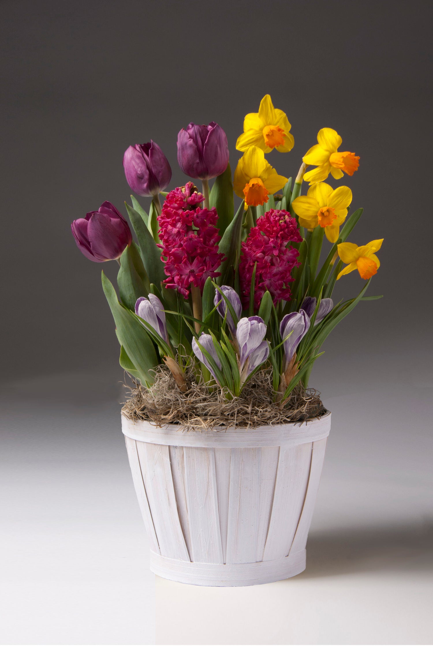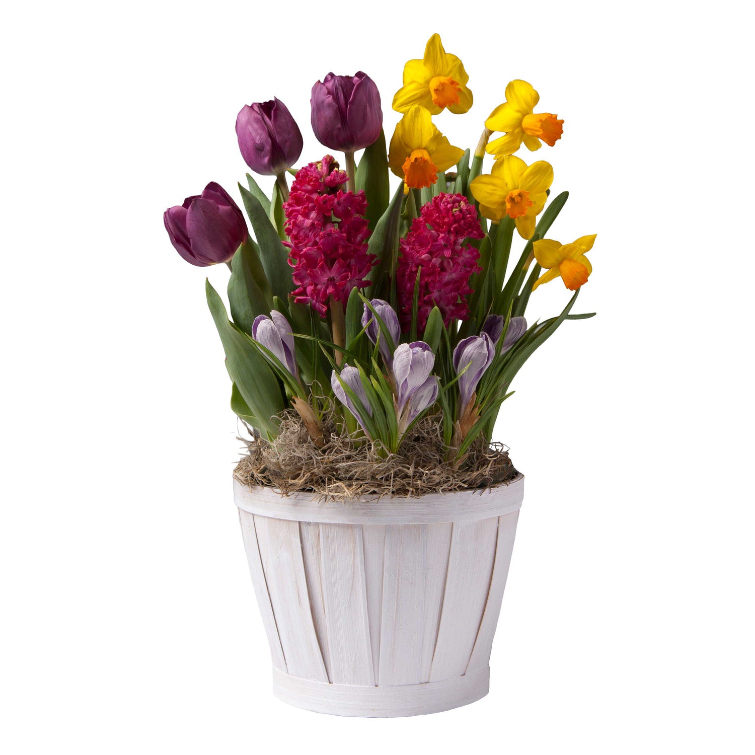 Celebrate the arrival of spring with our Mixed Tulip and Daffodil Spring Bulb Garden, a vibrant mix of blooming beauty that brings color and fragrance straight to your doorstep.This cheerful arrangement features a thoughtfully curated selection of premium spring bulbs—rich purple tulips, golden daffodils, vivid hyacinths, and delicate crocus—planted together in a charming whitewashed wooden slat basket. As each flower blooms in succession, it creates a layered, ever-changing display full of seasonal joy.