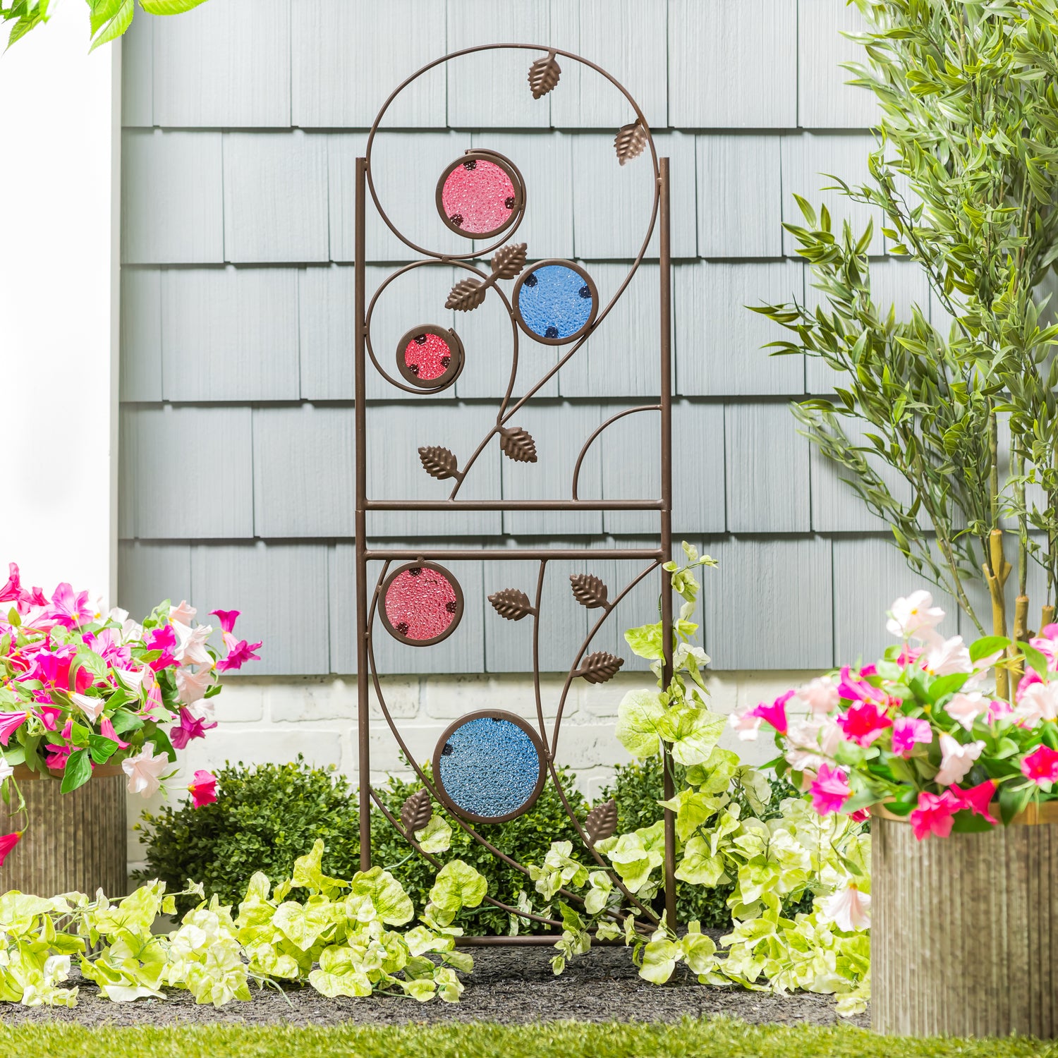 Turn any garden into a gallery with this elegant metal trellis adorned with colorful glass accents. The shimmering details catch the light and create a playful contrast with climbing greenery. It’s perfect for showcasing flowers, adding height to planters, or simply elevating the look of any outdoor space. With its blend of beauty and support, this trellis is a standout feature in any landscape.