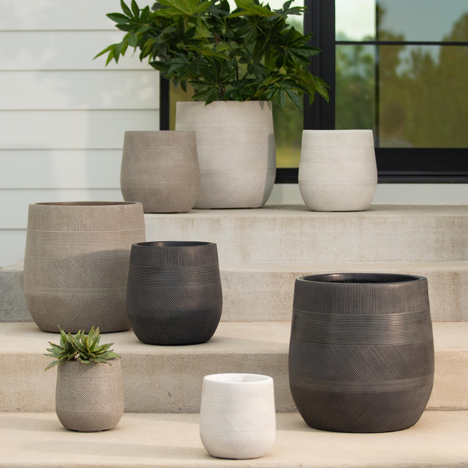 Add modern geometry to outdoor spaces with these Round Stripe Planters in garden-friendly neutrals. As if they were crafted from concrete, the planters are made of a lightweight fiber clay and magnesium mix, making them easy to position. The contemporary look works with most decor with its timeless style and chic sensibility. The gently sloping sides and cement-look construction make them a stunning home for your favorite plants. Arrange them together to create a gorgeous container garden for your patio, deck or balcony. Features a drainage hole with a removable rubber stopper.