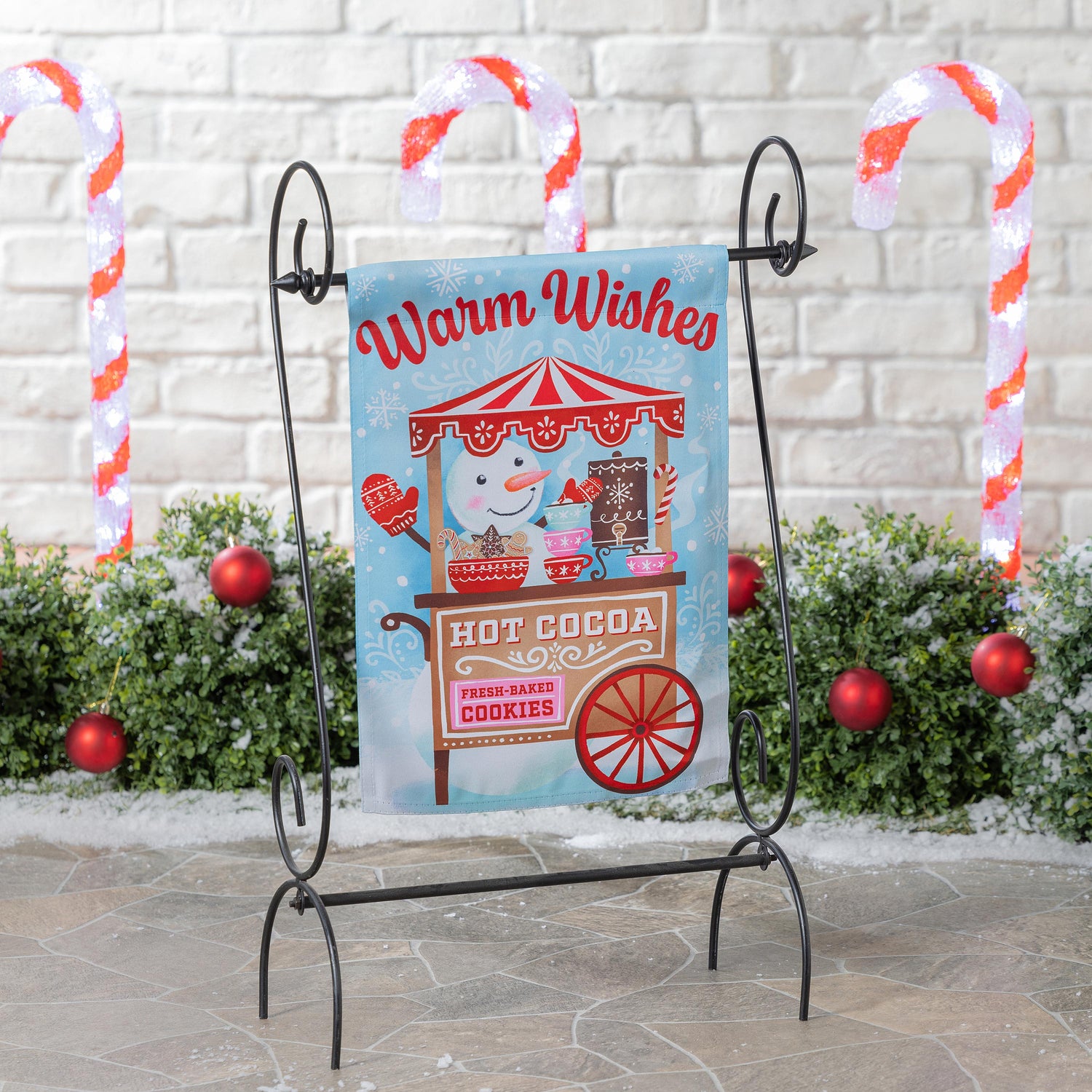 Add magic and wonder to any garden or yard when you hang up this beautiful flag. Featuring a friendly snowman serving hot cocoa, this flag is perfect for the festive season. Flag is crafted of medium-weight suede fabric made from recycled plastic that provides a soft and durable texture. Artwork is heat transferred onto the sun-blocking material so that it is easily viewed from both sides. The weatherproof flag will not fray or fade with continued outdoor use. This flag features a sleeve for use with any standard flagpole or stand, sold separately.