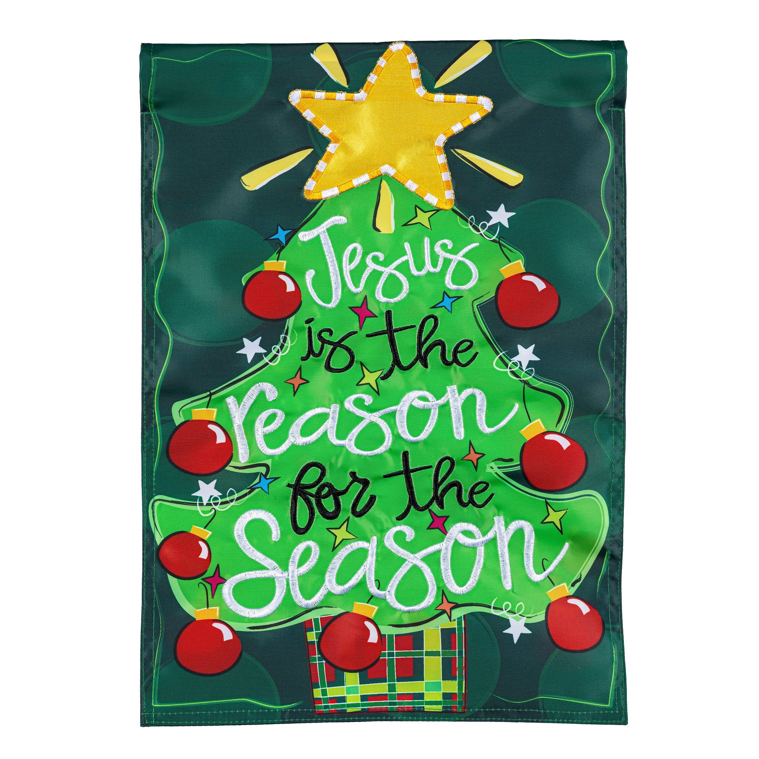 Add magic and wonder to any garden or yard when you hang up this beautiful flag. Featuring a Christmas tree with a heartwarming message, this flag is perfect for the festive season. Each Evergreen applique flag is carefully crafted from multiple layers of 310 denier nylon made from recycled plastic that can withstand a variety of weather conditions. We combine pieces of fade-resistant, strong fabric with tight, detailed stitching to create a dimensional mosaic effect. The soft yet heavyweight material illuminates beautifully in sunlight. Each flag features a sleeve that fits standard flagpoles or stands, sold separately. Due to the nature of the packaging, wrinkling may have occurred. Once item is unfolded and mounted on hardware, the creases will naturally fall out. Spot clean only. Never put in a dryer. When not in use, flags can be hung in a closet or placed in a storage container.