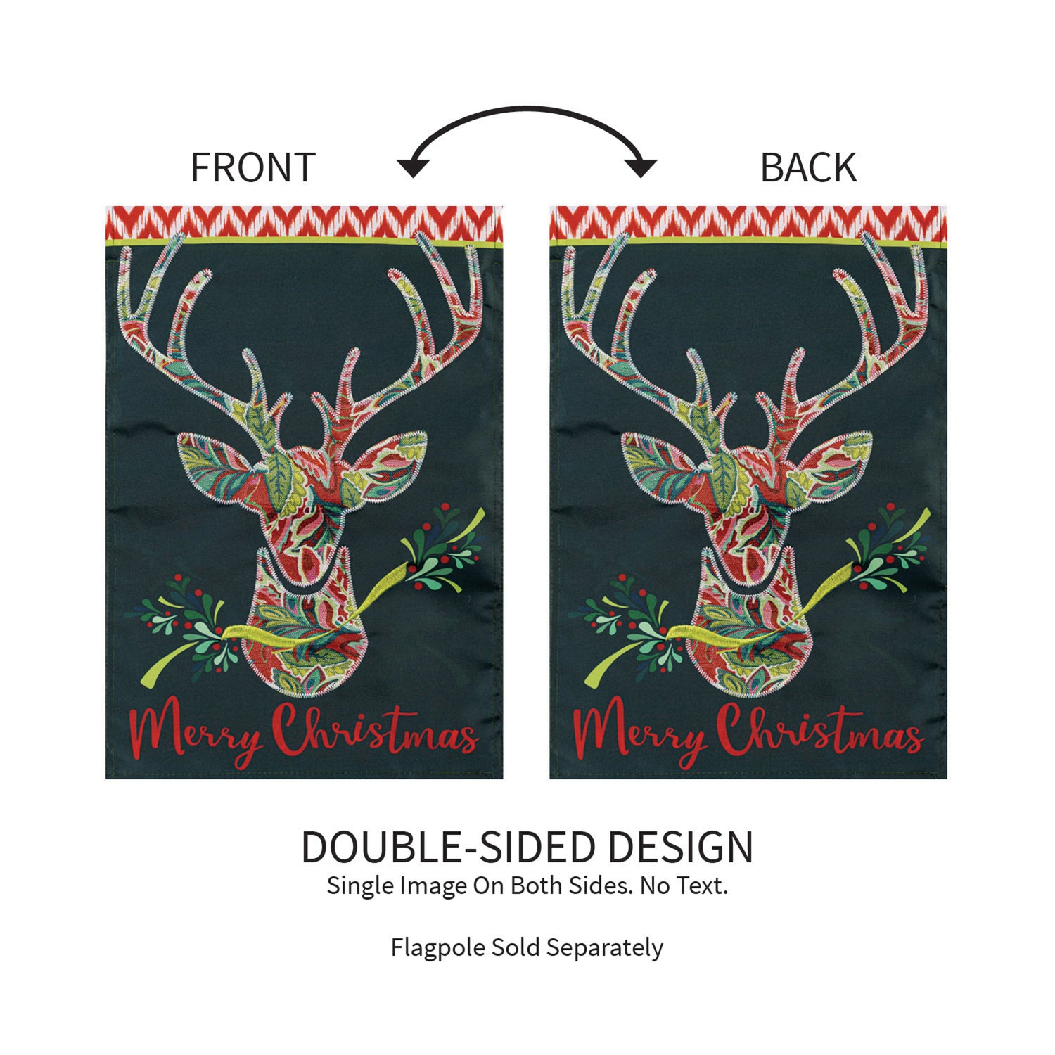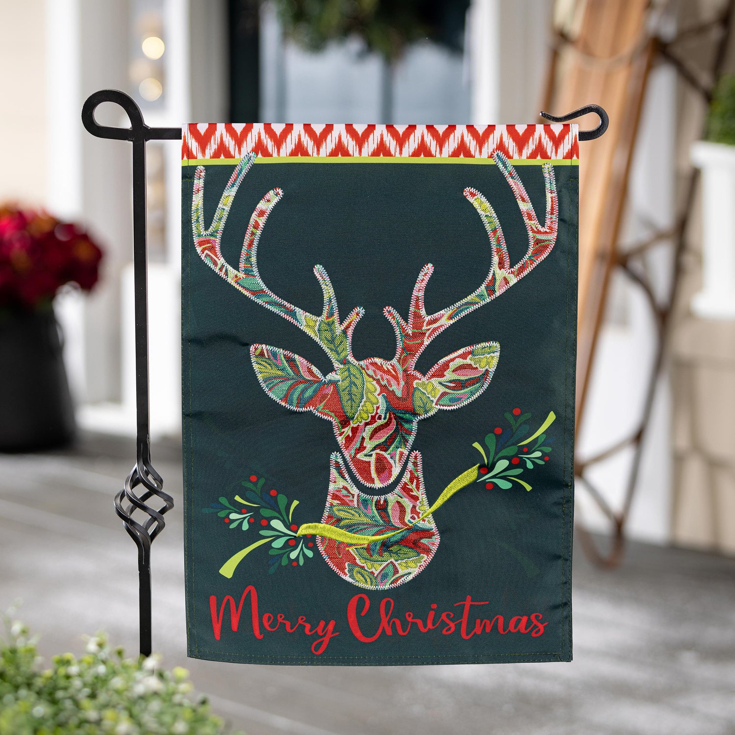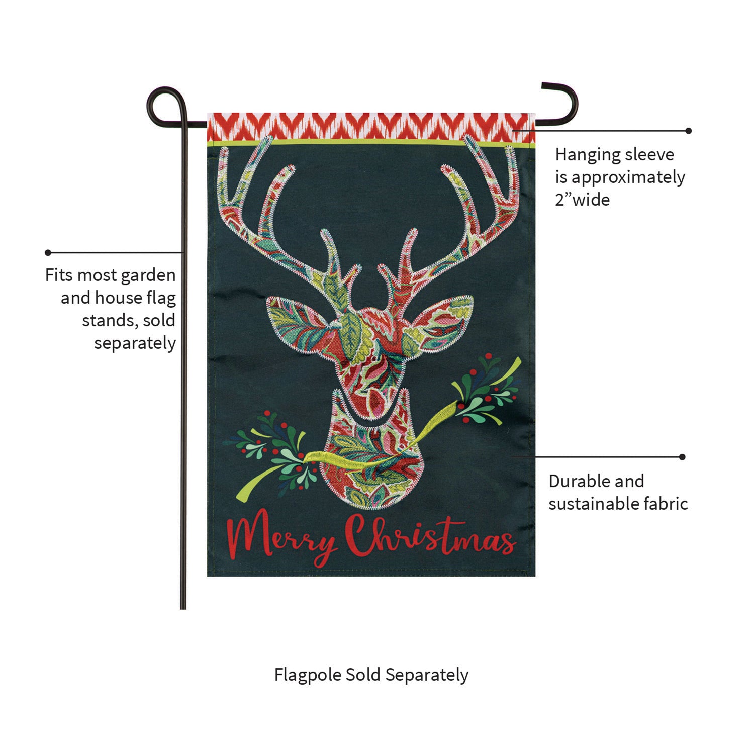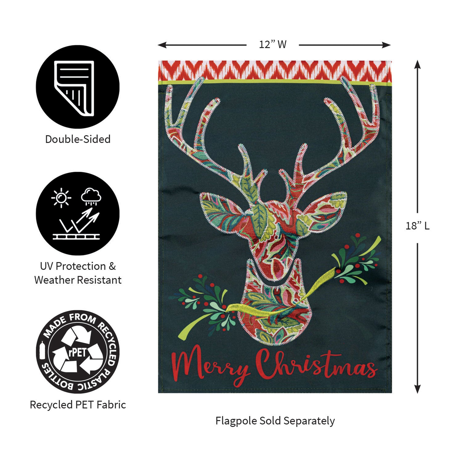 Add magic and wonder to any garden or yard when you hang up this beautiful flag. Featuring a deer silhouette with winter foliage accents, this flag is perfect for the festive season. Each Evergreen applique flag is carefully crafted from multiple layers of 310 denier nylon made from recycled plastic that can withstand a variety of weather conditions. We combine pieces of fade-resistant, strong fabric with tight, detailed stitching to create a dimensional mosaic effect. The soft yet heavyweight material illuminates beautifully in sunlight. Each flag features a sleeve that fits standard flagpoles or stands, sold separately. Due to the nature of the packaging, wrinkling may have occurred. Once item is unfolded and mounted on hardware, the creases will naturally fall out. Spot clean only. Never put in a dryer. When not in use, flags can be hung in a closet or placed in a storage container.
