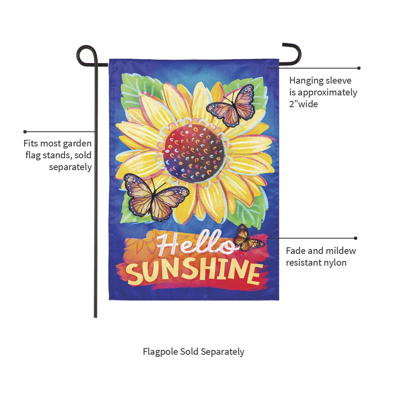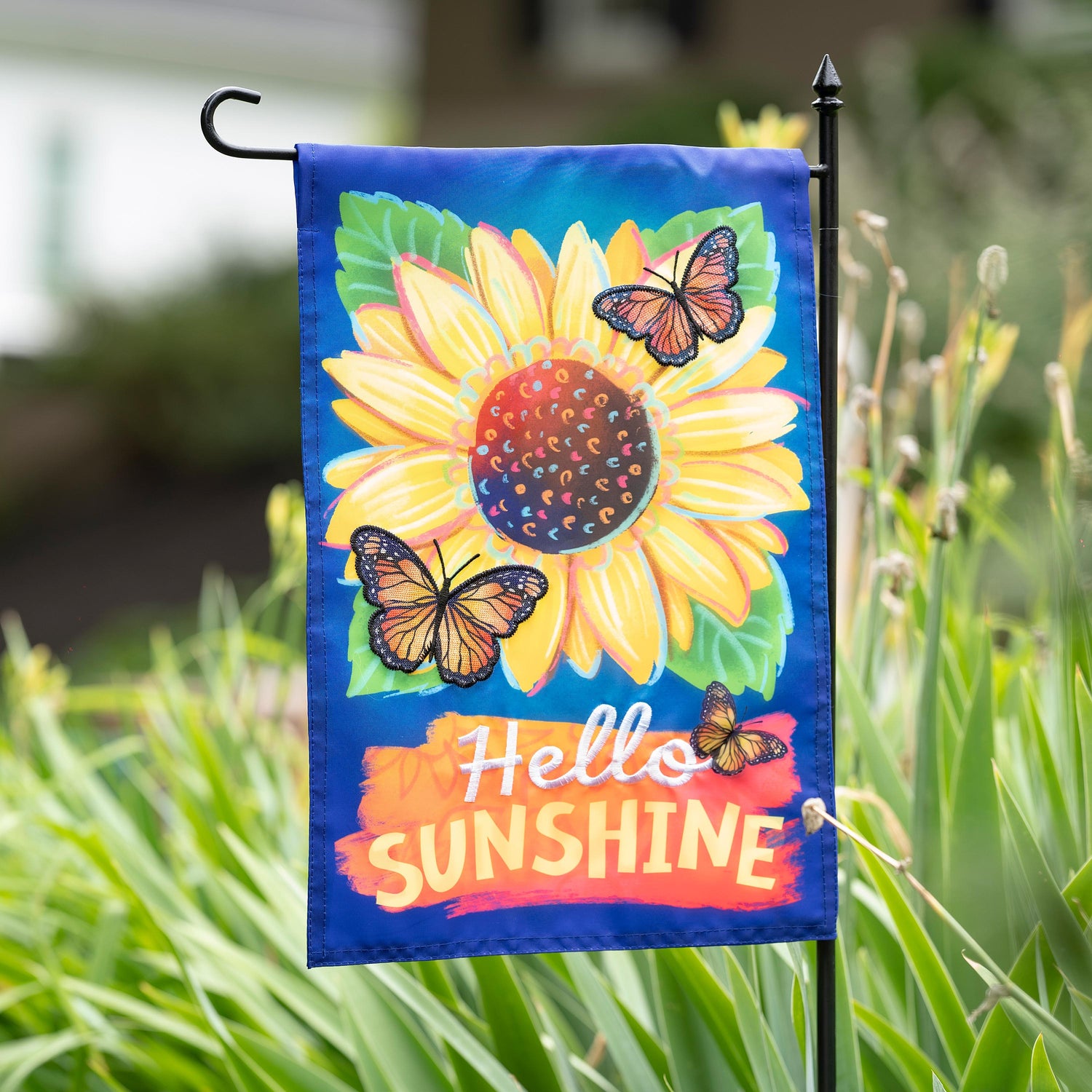 Brighten your garden with a burst of cheer! This Hello Sunshine Garden Flag features a radiant sunflower in full bloom, accented with three fluttering butterflies and bold, joyful lettering. Set against a deep blue background with colorful painterly brush strokes, this vibrant flag is a celebration of summer's warmth and nature's beauty.