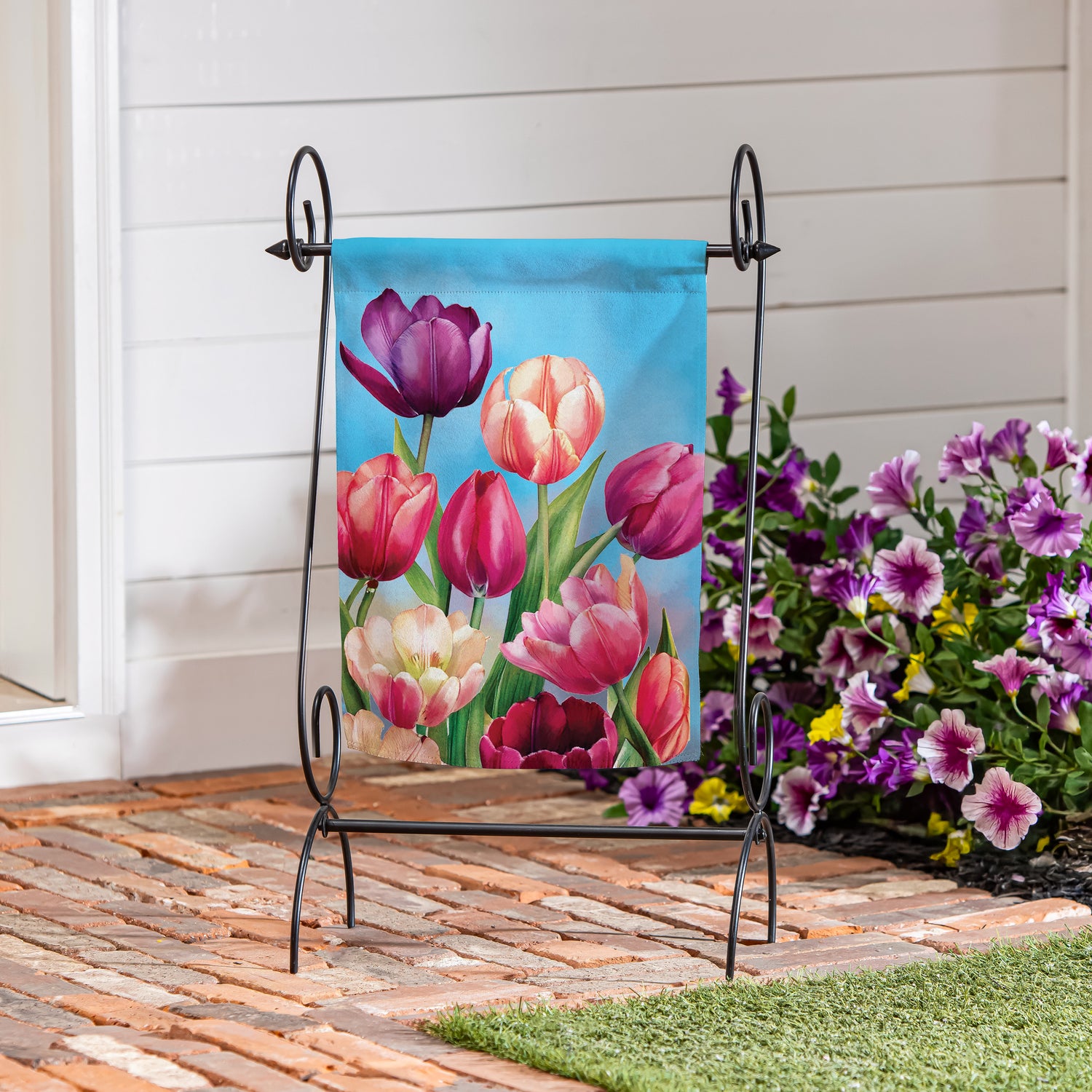 Bursting with bright colors and a detailed, lively design that adds beauty to any space, this flag is perfect for spring and beyond. Hang it in the garden to greet guests, neighbors, and friends. Flag is crafted of medium-weight suede fabric made from recycled plastic that provides a soft and durable texture. Artwork is heat transferred onto the sun-blocking material so that it is easily viewed from both sides. The weatherproof flag will not fray or fade with continued outdoor use. This flag features a sleeve for use with any standard flagpole or stand, sold separately.