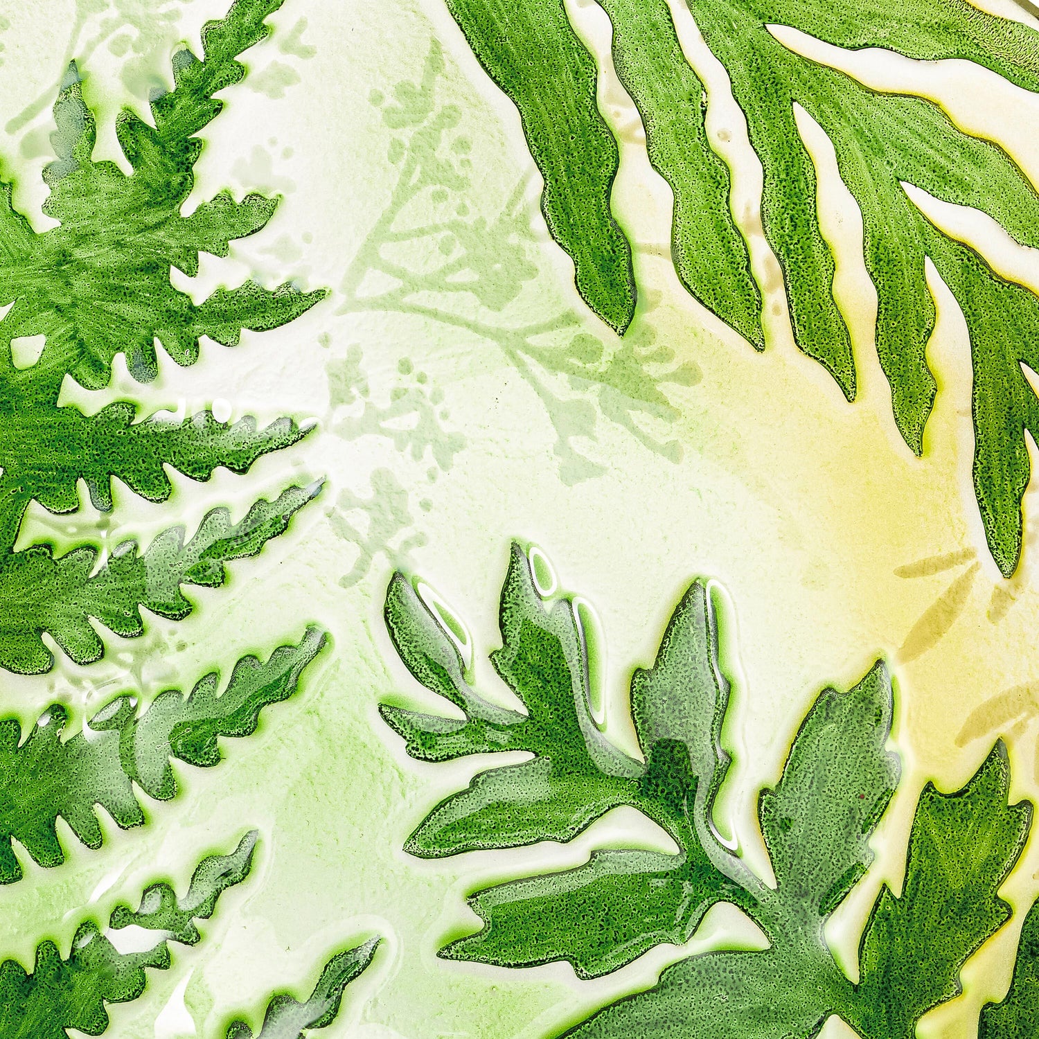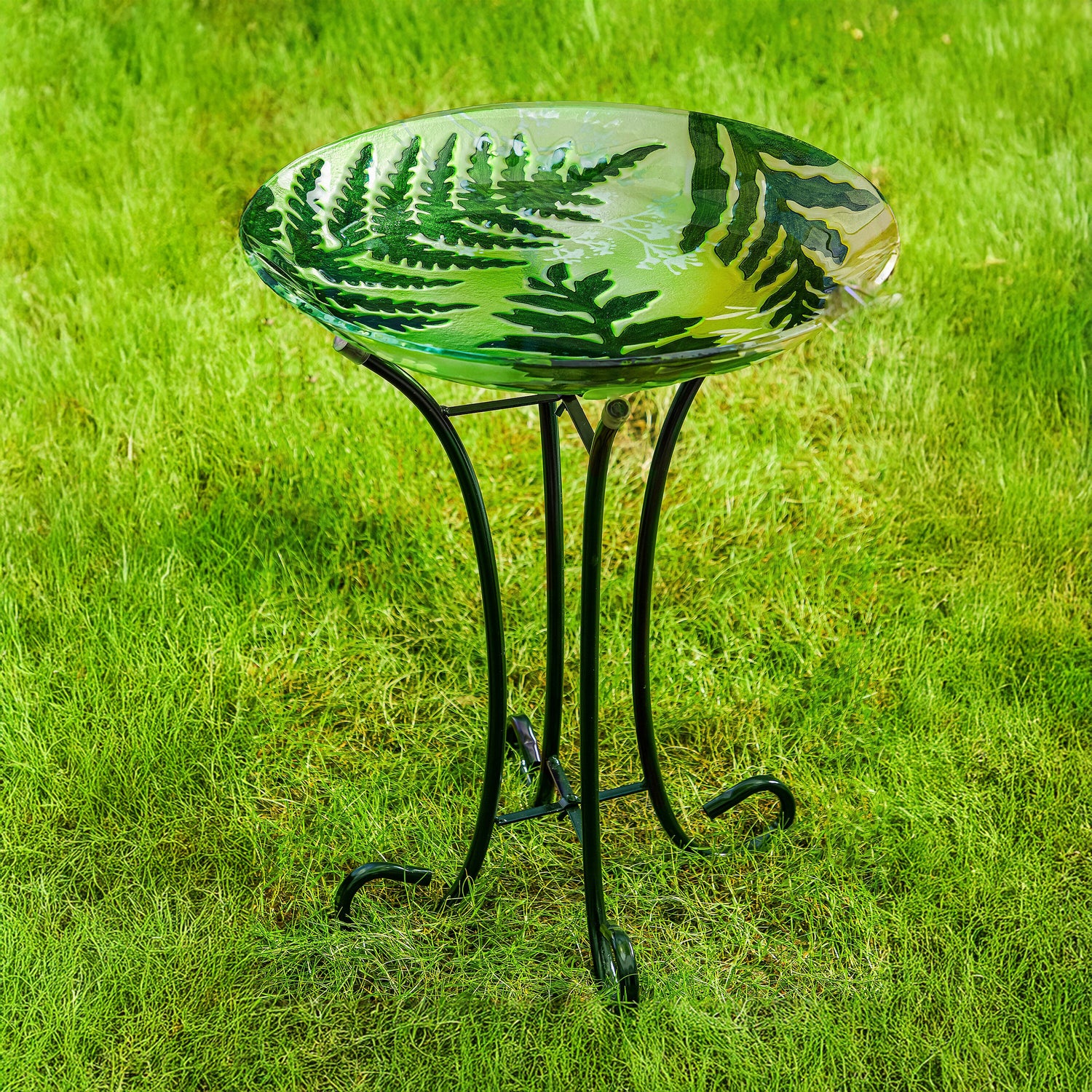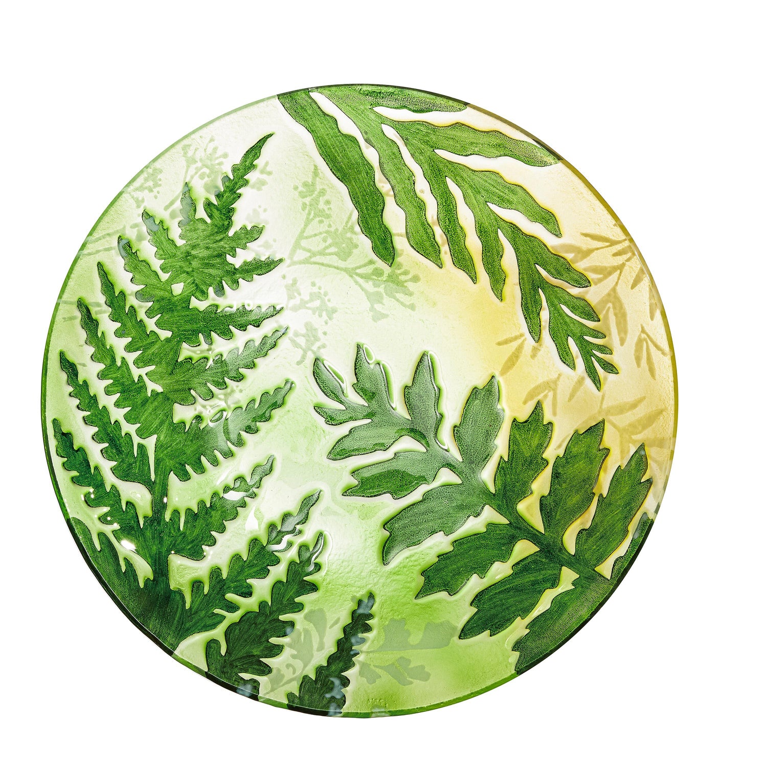 The bird bath showcases lush green ferns and botanical stems in a nature-inspired design that is enhanced with embossed finish. Crafted from durable glass, the bowl is outdoor-safe and fade-resistant to ensure it stays vibrant season after season.