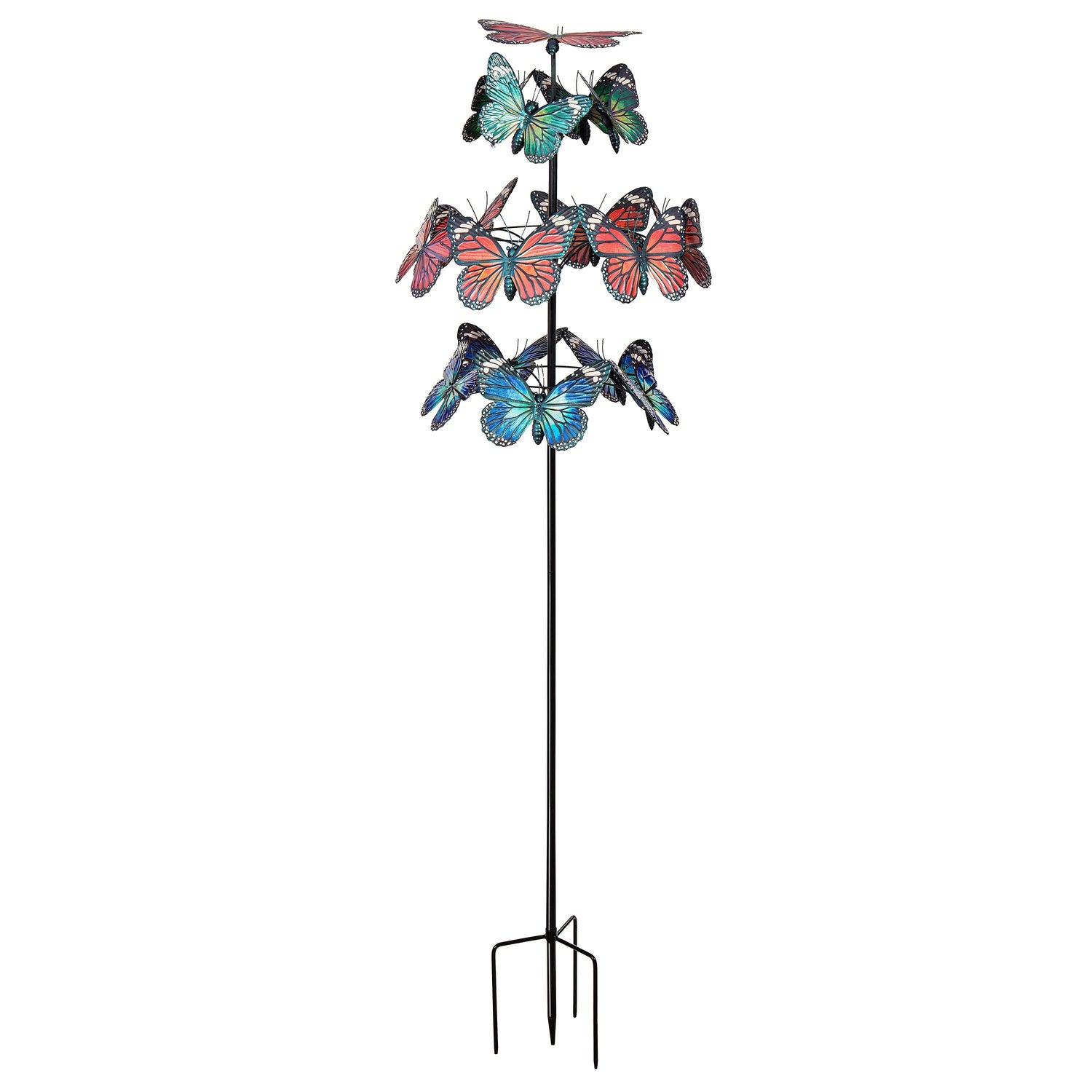 This eye-catching spinner features three tiers of intricately designed butterflies in vibrant hues of blue, green, and red, each fluttering in the breeze as the wind catches them. Crafted from weather-resistant metal with a black powder-coated stake for stability, it creates a mesmerizing display day or night.