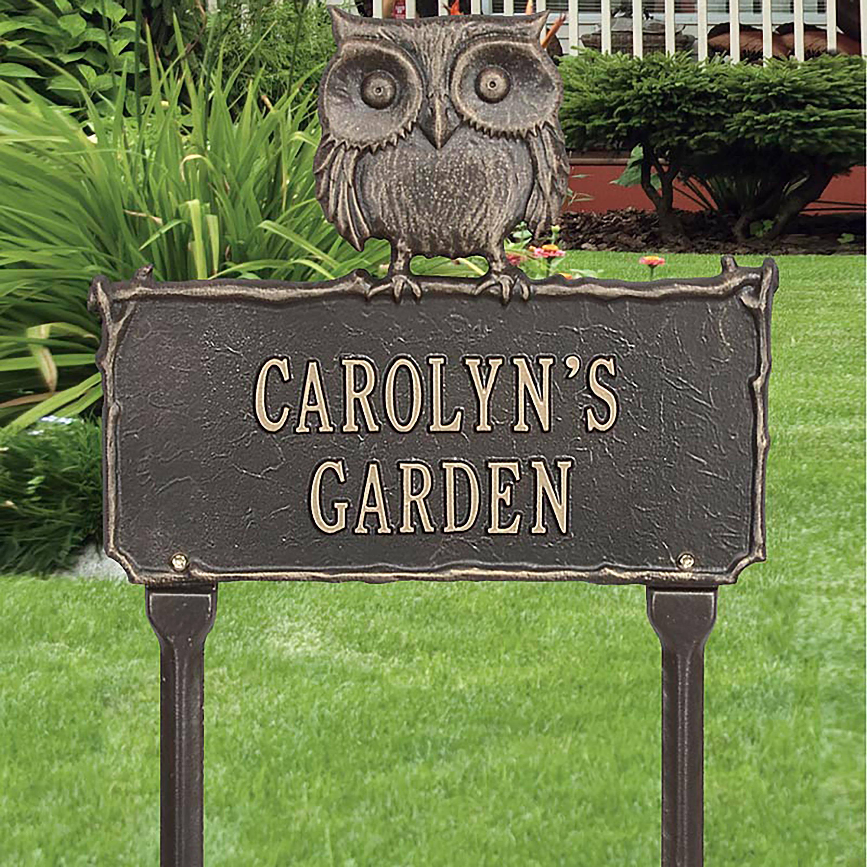 The delightful owl design originates from a hand carving. Cast of durable recycled aluminum in a bronze finish, the sign won't rust in harsh weather conditions. Two 18" lawn stakes and hardware are included. Personalize it with any saying or greeting: two lines of up to twelve letters.