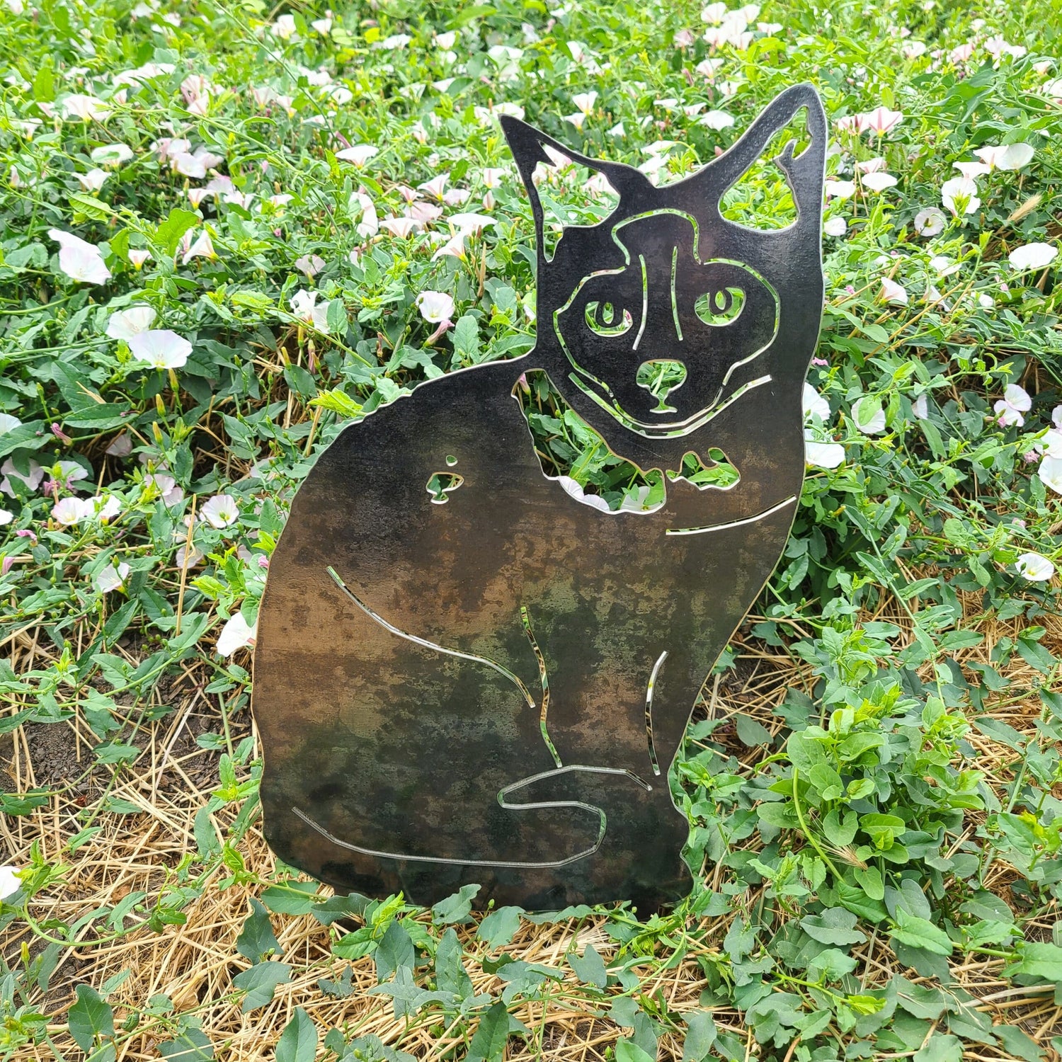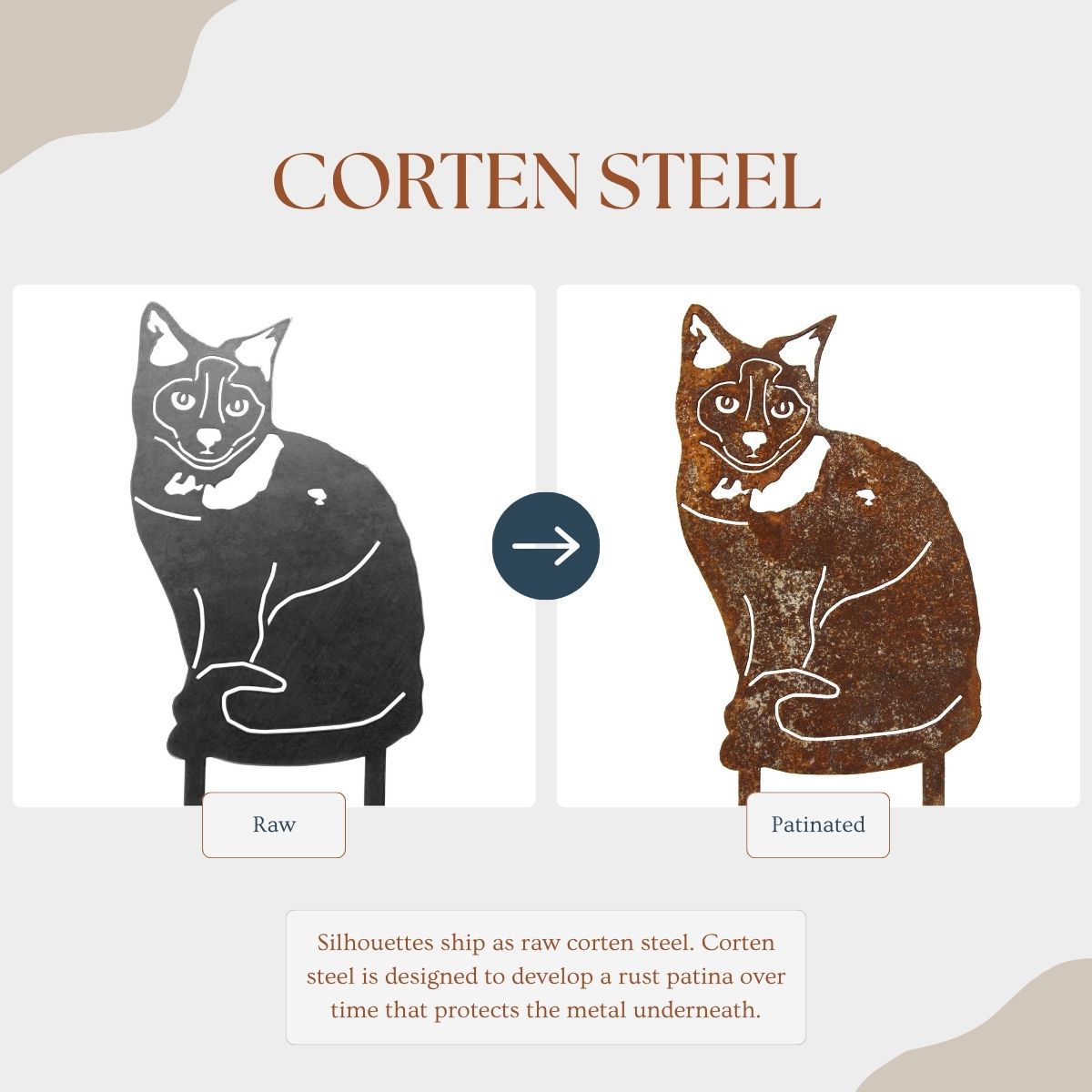 The Corten steel finish is designed to develop a beautiful patina rust coating that will change over time, protecting the steel underneath. These silhouettes ship out as raw steel and will develop a patina if left in the weather or frequently exposed to wet conditions. The color of the patina should change over time, starting as brighter orange tones and changing to darker brown tones.