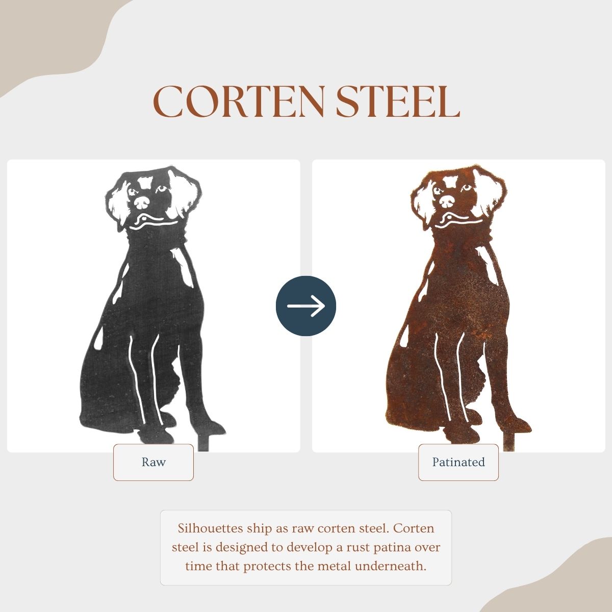 The Corten steel finish is designed to develop a beautiful patina rust coating that will change over time, protecting the steel underneath. These silhouettes ship out as raw steel and will develop a patina if left in the weather or frequently exposed to wet conditions. The color of the patina should change over time, starting as brighter orange tones and changing to darker brown tones.