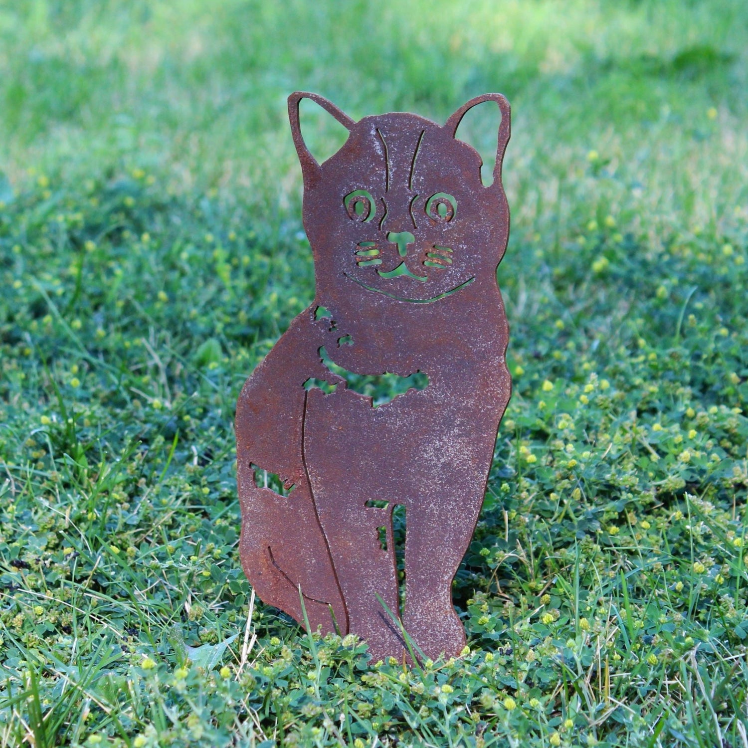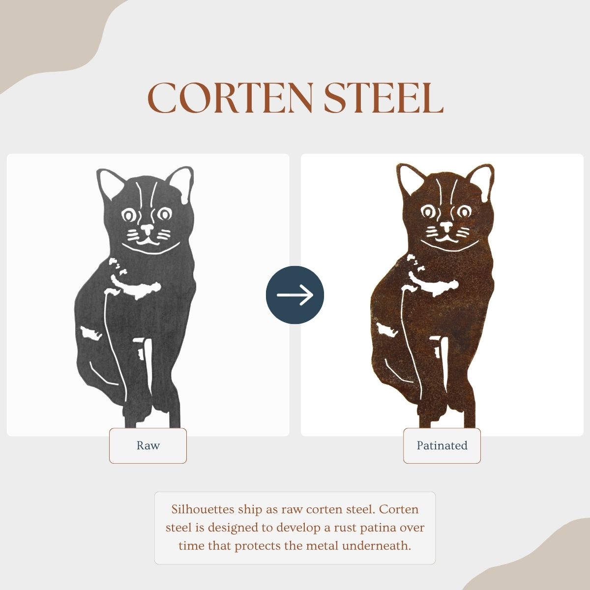 The Corten steel finish is designed to develop a beautiful patina rust coating that will change over time, protecting the steel underneath. These silhouettes ship out as raw steel and will develop a patina if left in the weather or frequently exposed to wet conditions. The color of the patina should change over time, starting as brighter orange tones and changing to darker brown tones.