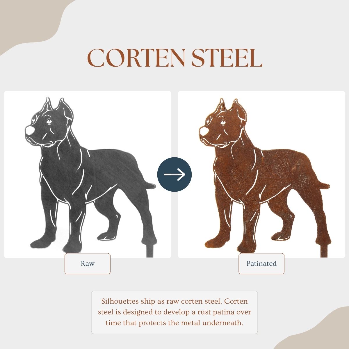 Metal Rescue silhouettes are handmade in the United States from sturdy 11 gauge premium weathering steel, also known as Corten steel. Each design is available in two different finishes- Corten steel and Black.