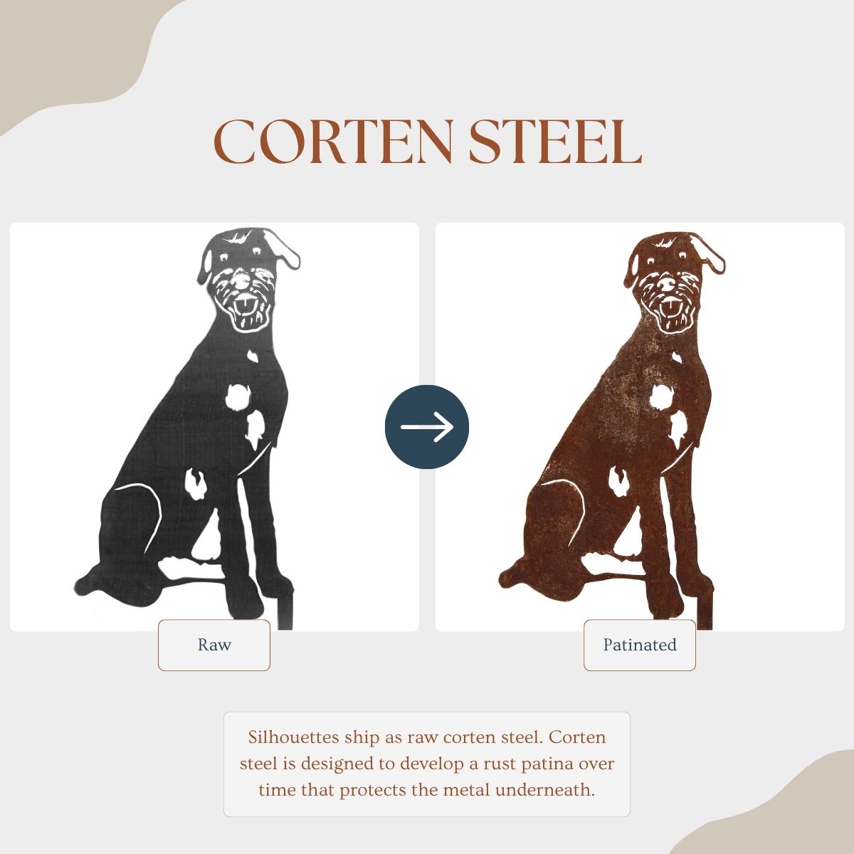 The Corten steel finish is designed to develop a beautiful patina rust coating that will change over time, protecting the steel underneath. These silhouettes ship out as raw steel and will develop a patina if left in the weather or frequently exposed to wet conditions. The color of the patina should change over time, starting as brighter orange tones and changing to darker brown tones.