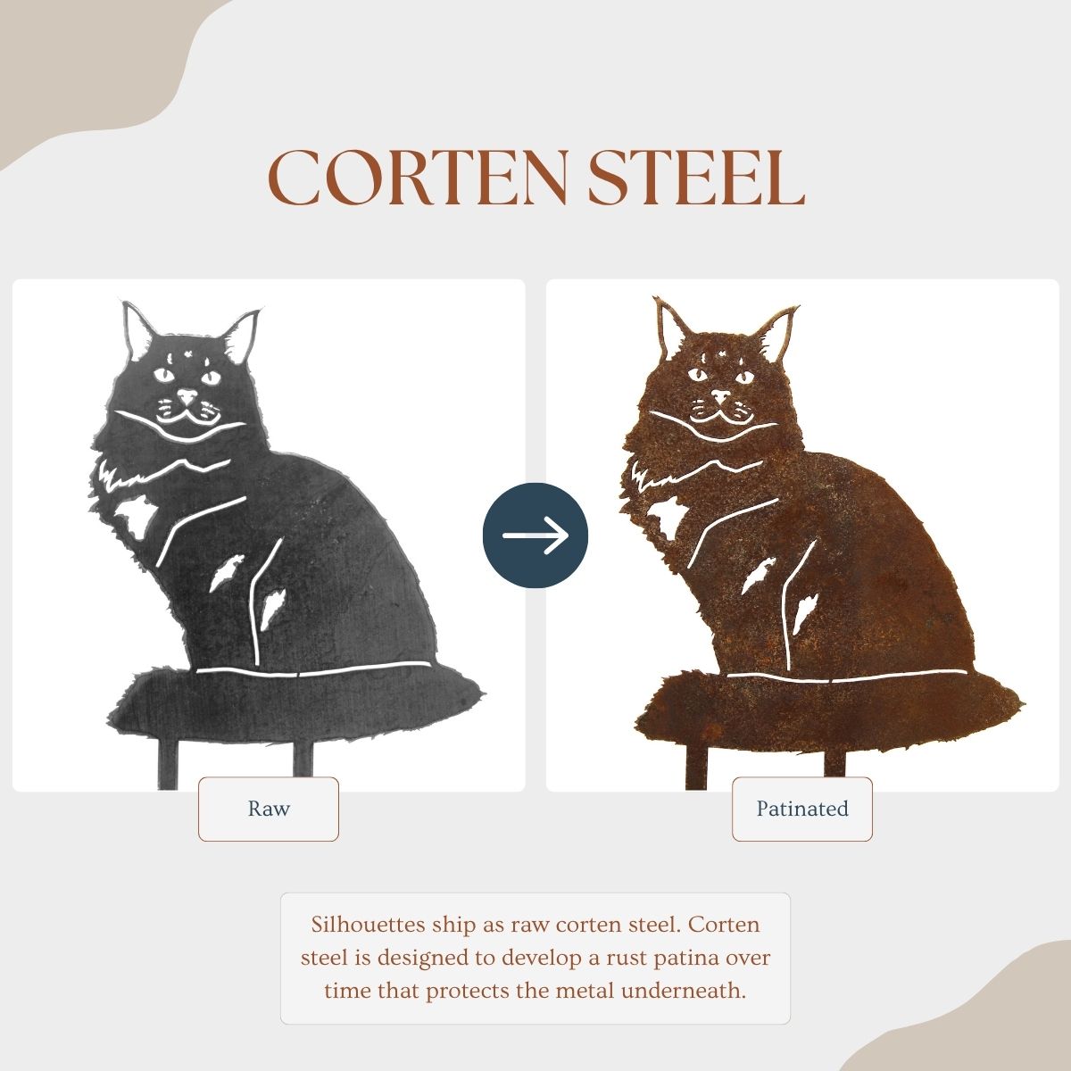 The Corten steel finish is designed to develop a beautiful patina rust coating that will change over time, protecting the steel underneath. These silhouettes ship out as raw steel and will develop a patina if left in the weather or frequently exposed to wet conditions. The color of the patina should change over time, starting as brighter orange tones and changing to darker brown tones.