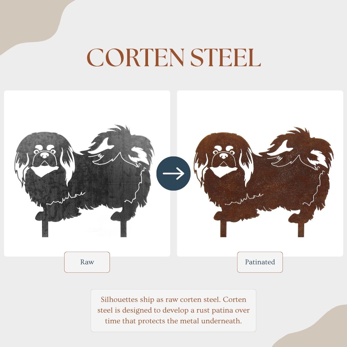 The Corten steel finish is designed to develop a beautiful patina rust coating that will change over time, protecting the steel underneath. These silhouettes ship out as raw steel and will develop a patina if left in the weather or frequently exposed to wet conditions. The color of the patina should change over time, starting as brighter orange tones and changing to darker brown tones.