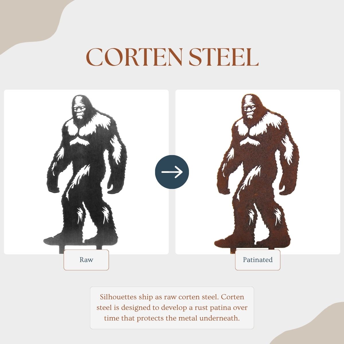 The Corten steel finish is designed to develop a beautiful patina rust coating that will change over time, protecting the steel underneath. These silhouettes ship out as raw steel and will develop a patina if left in the weather or frequently exposed to wet conditions. The color of the patina should change over time, starting as brighter orange tones and changing to darker brown tones.