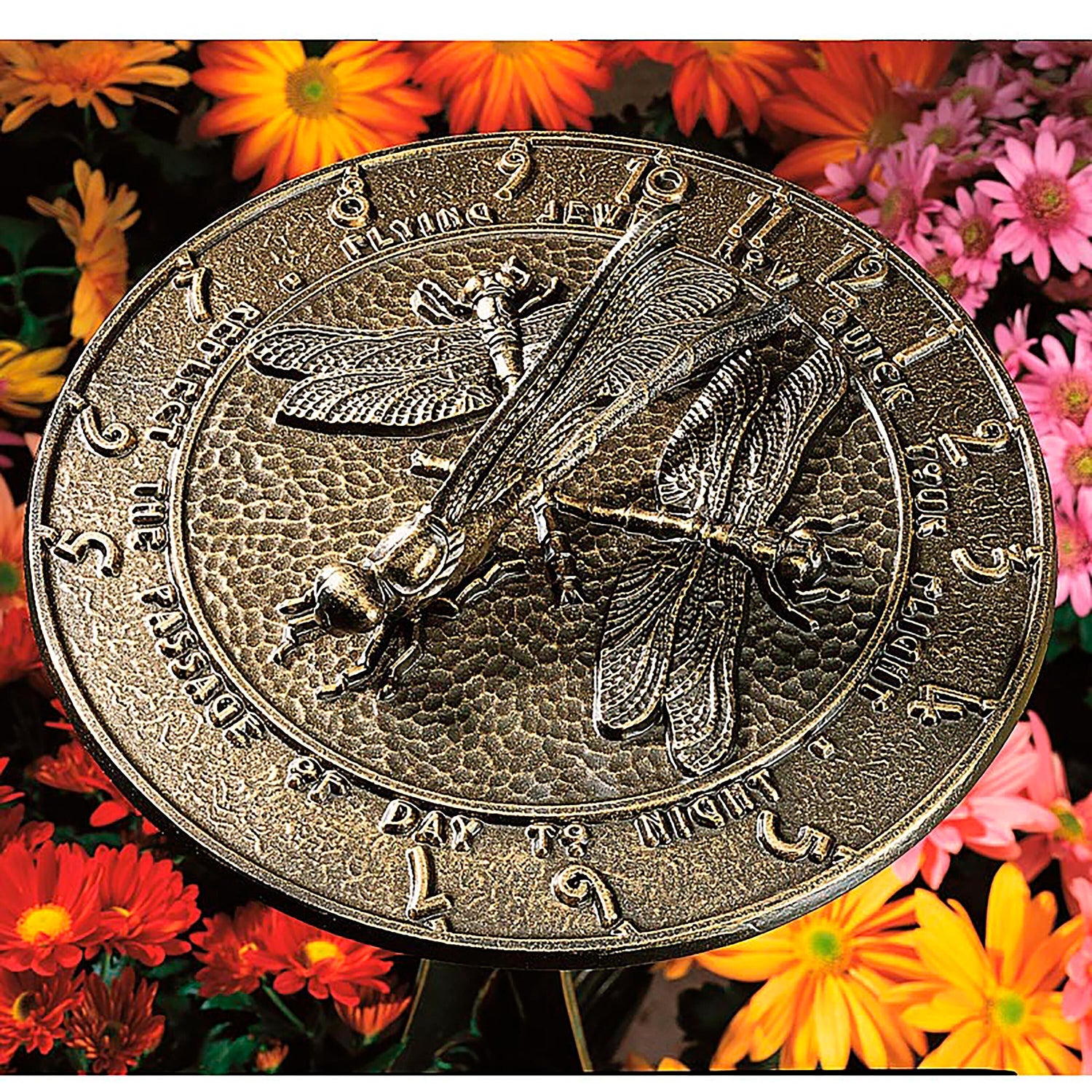 Our Dragonfly Sundial adds classic charm to your backyard. Just place it on the ground or other flat surface with the dial pointing at celestial north the graceful dragonfly's delicate wings connect to the center of the piece, their shadow falling on the line indicating the time as the sunlight changes. An elaborately cast design made up of two more dragonflies ornaments the round cast-aluminum piece. Sturdily constructed in America of rustproof recycled cast aluminum, it will offer many years of enjoyment.