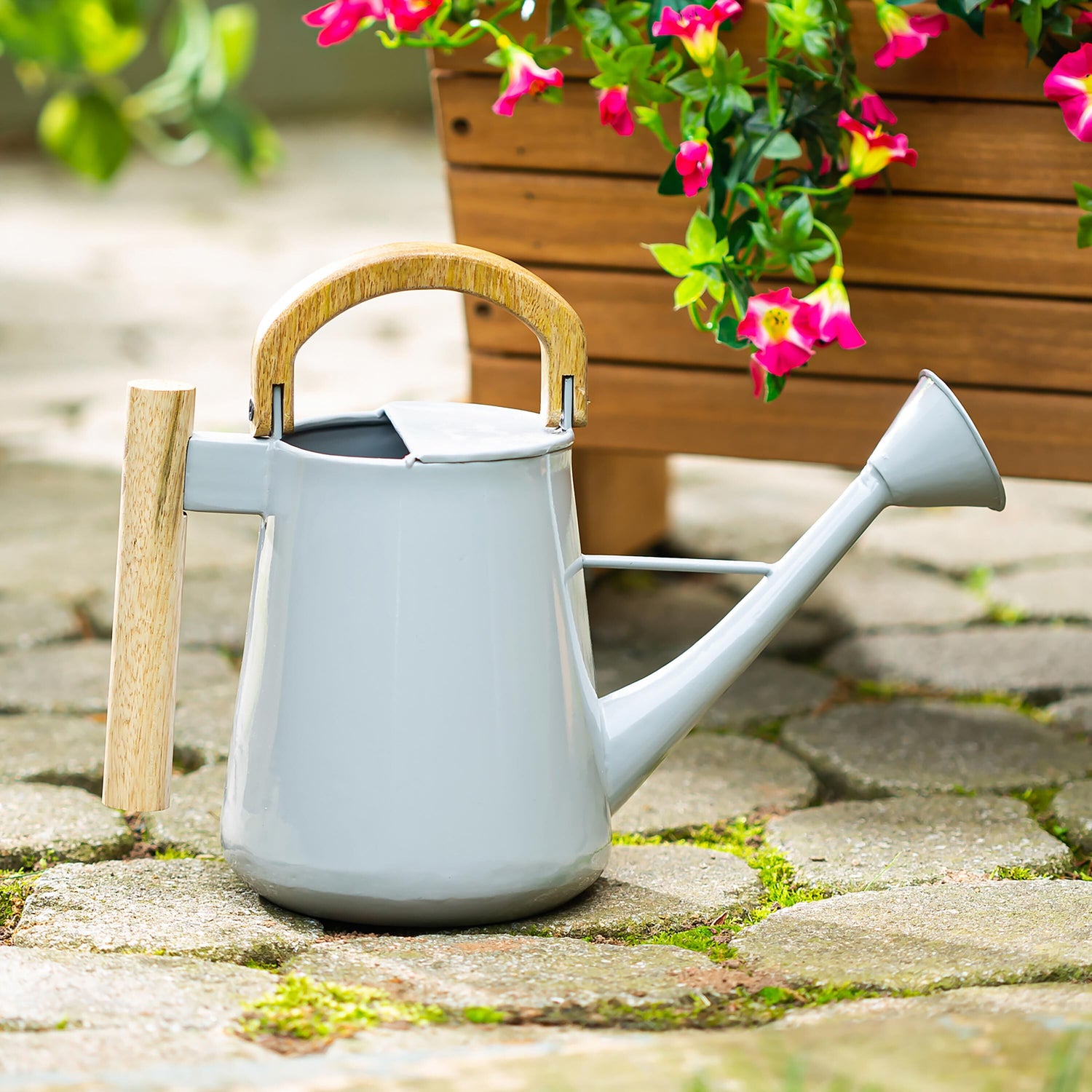 Ideal for meeting all your plants’ needs, this two-toned watering can features a sleek grey body with wooden handles. Perfect for watering all your plants in elegant style!