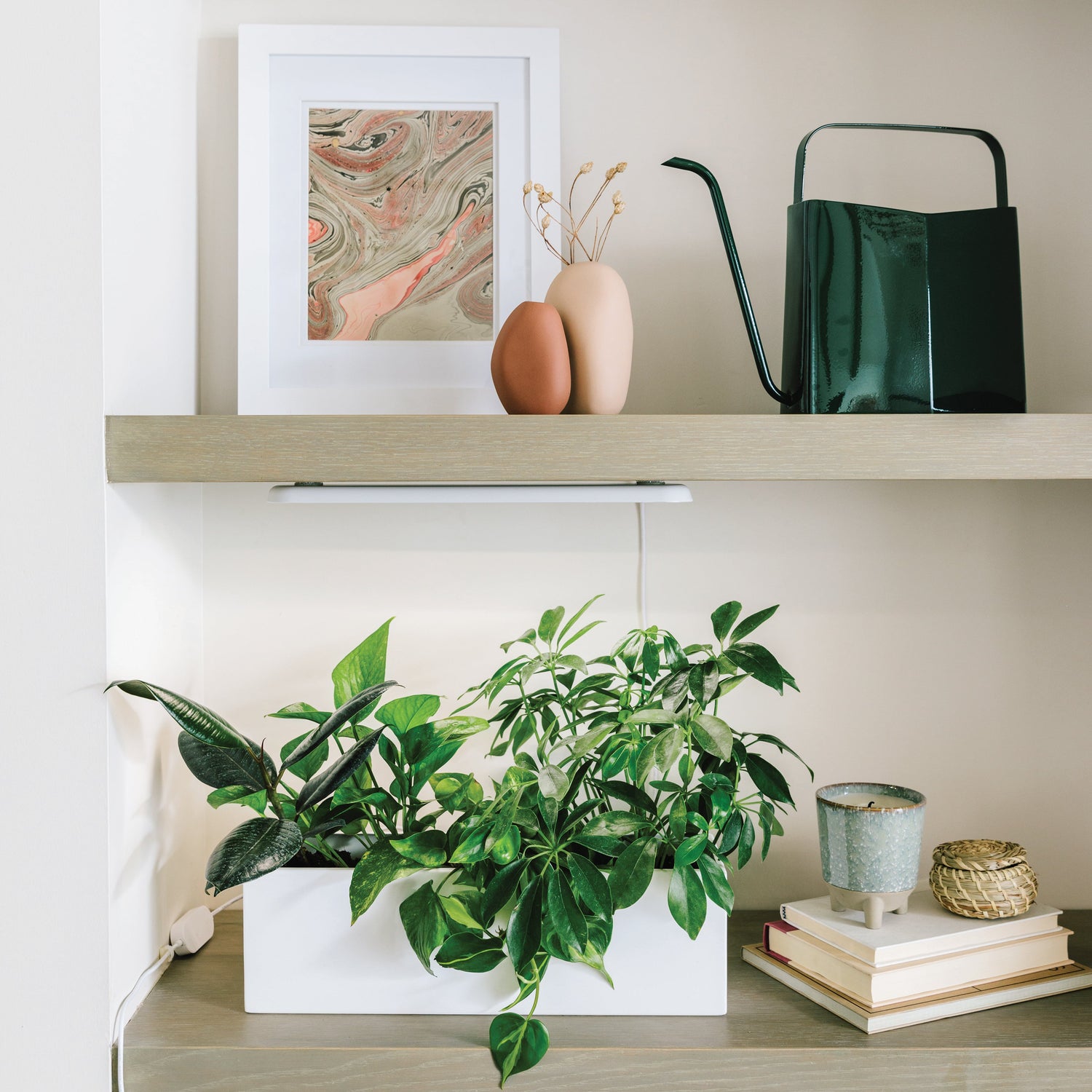 Plants will thrive anywhere in your home with our sleek Growbar. A low-profile flush-mount metal fixture, transform any shelf or bookcase into the perfect place for plants. Full-spectrum LED grow light emits a warm light that doesn't feel harsh or off-putting in your living space. Powered by our exclusive Smart App, you can set custom schedules and brightness for your plants.