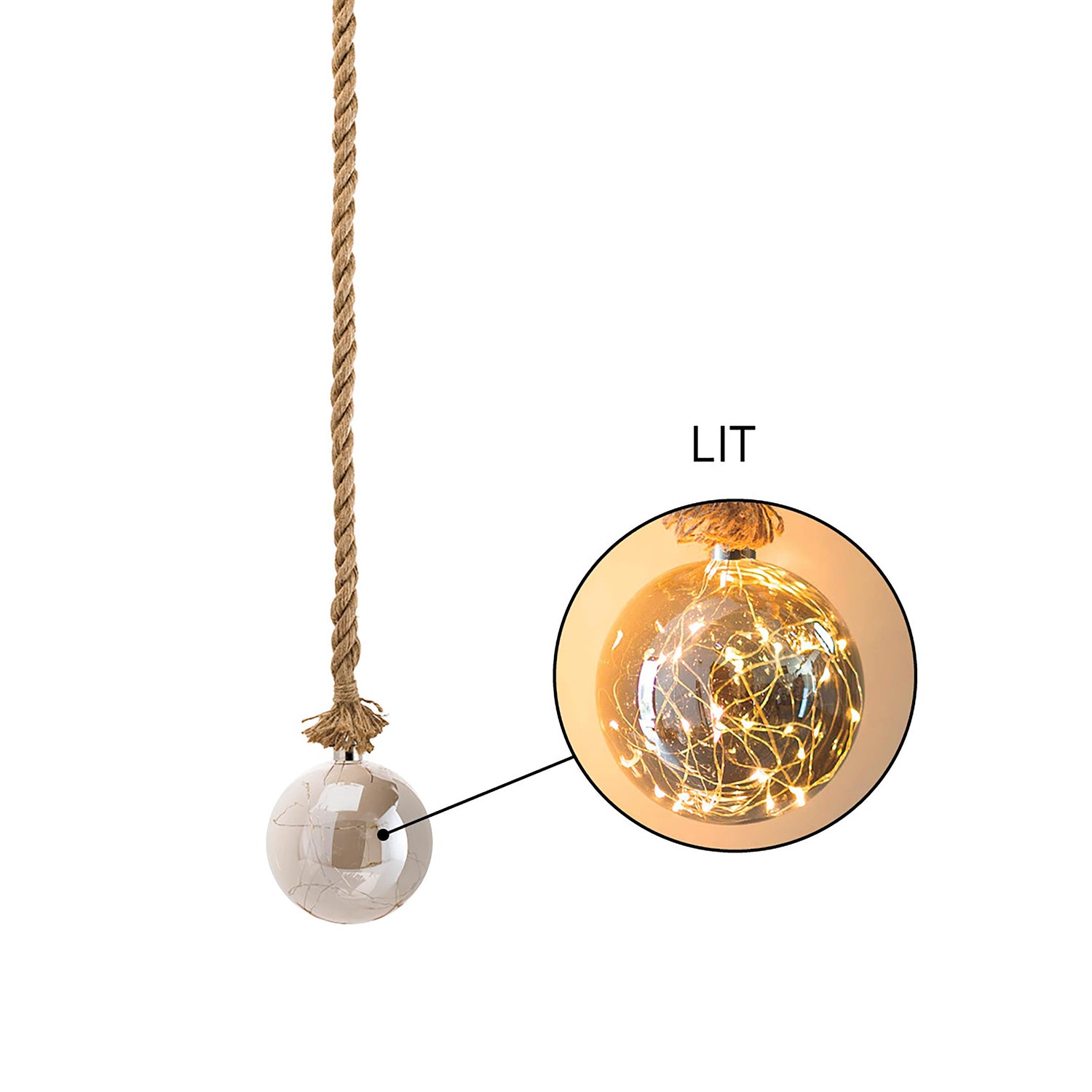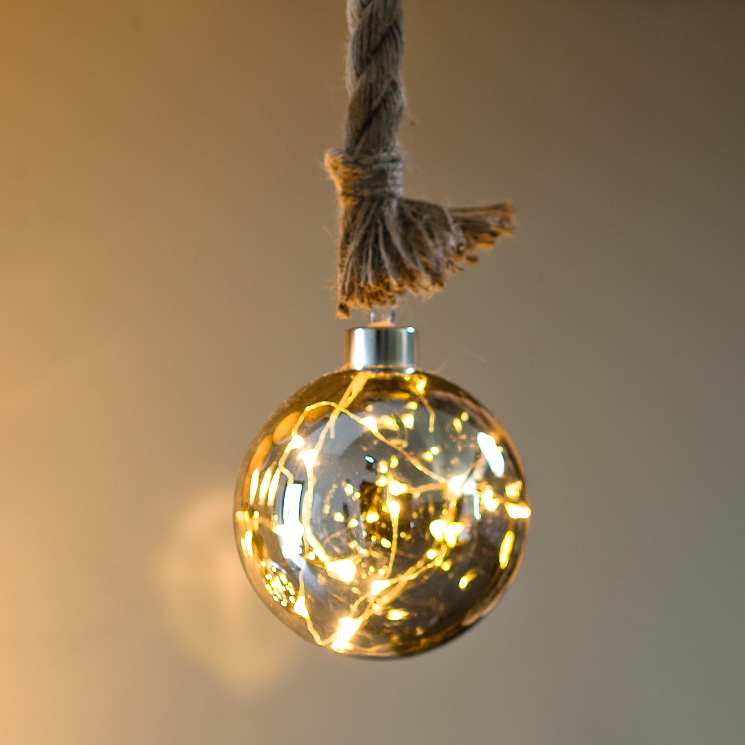 Add a warm and whimsical glow to any space with our Hanging Glass Globe Light with Rope. This beautiful orb features a clear glass finish that showcases a string of warm white micro LED lights inside, creating a cozy sparkle that instantly elevates your décor. Suspended by a rustic rope with a decorative knot, it blends industrial charm with farmhouse elegance.