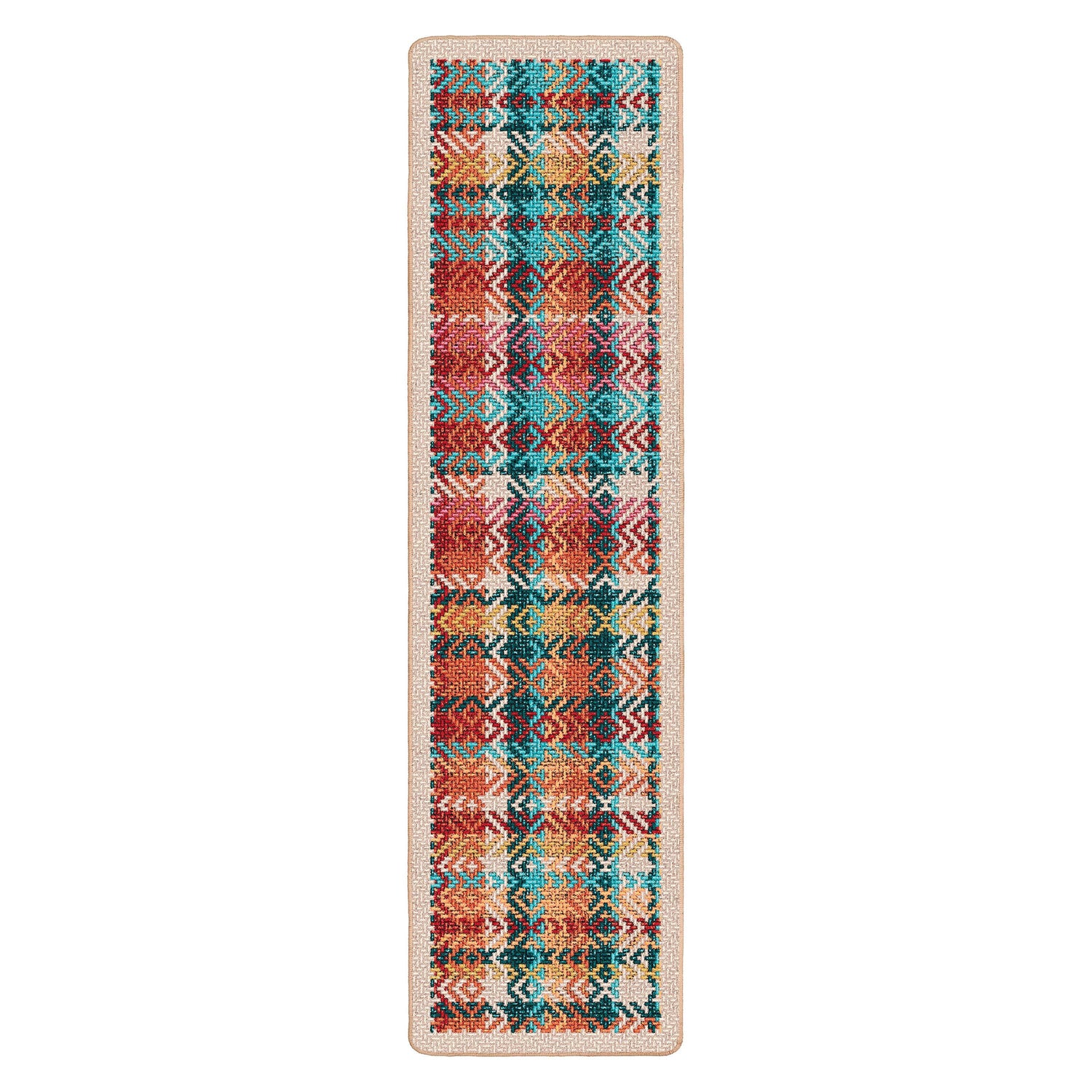 The design features vibrant colors and a plaid-style pattern with a subtle border that works wonders in casual as well as rustic decor. Ideal for high-traffic areas, like living room, family room, sunroom and even mudroom.