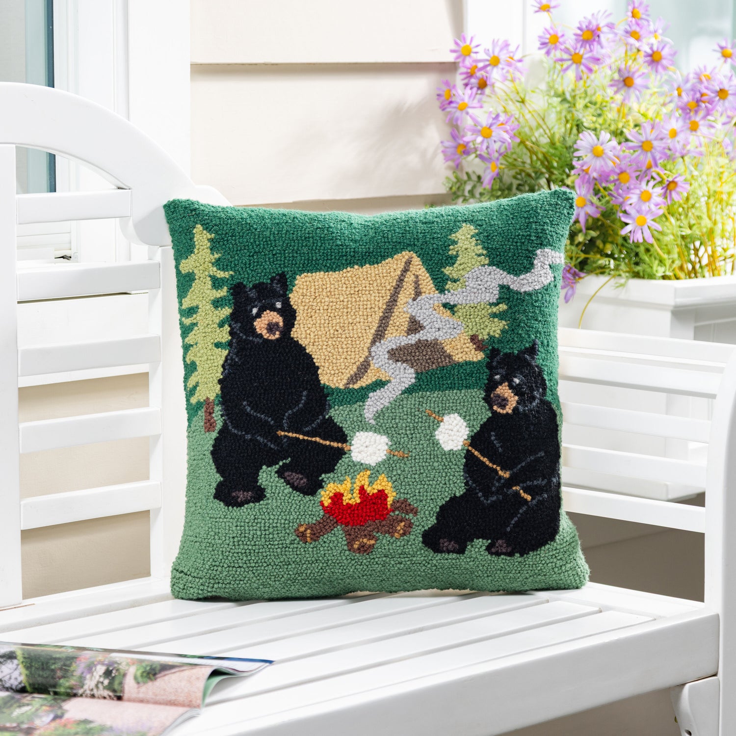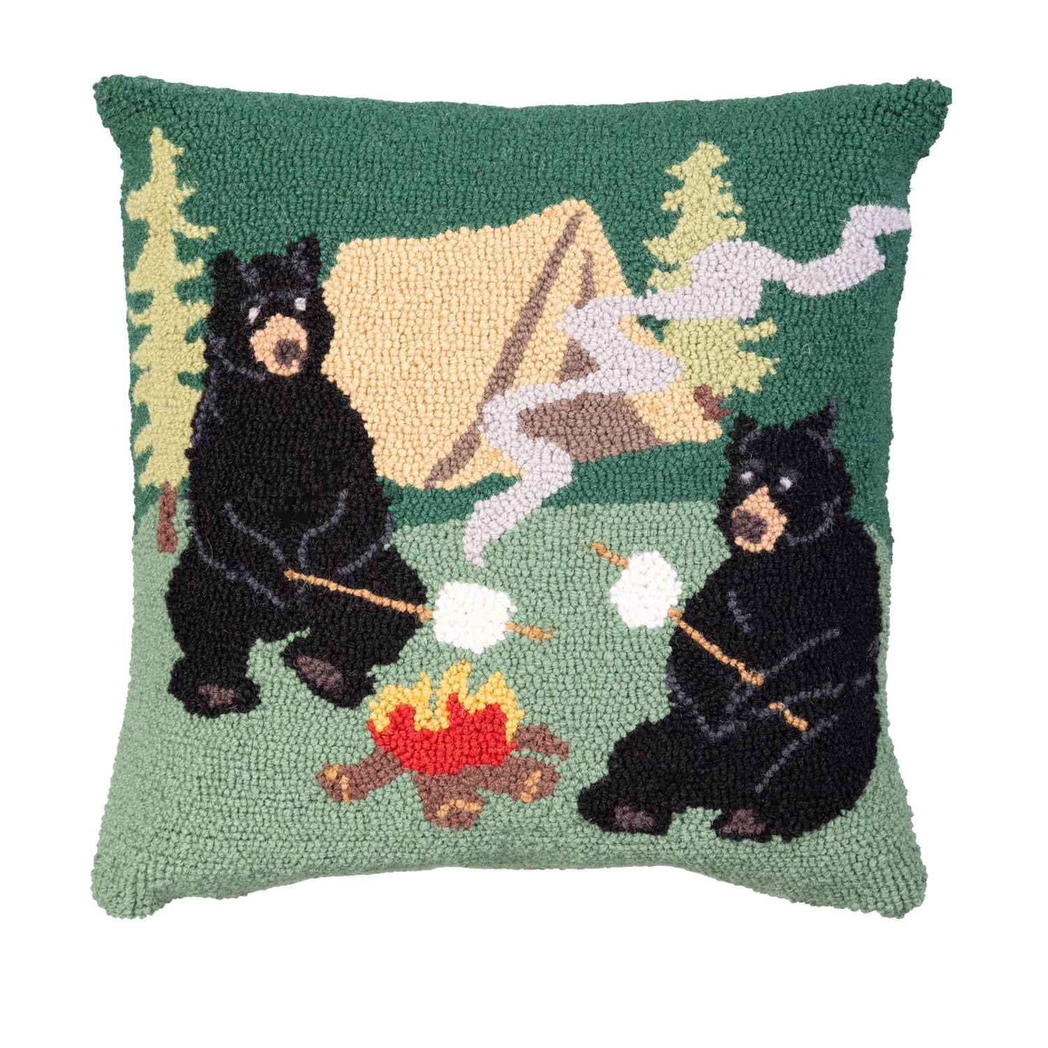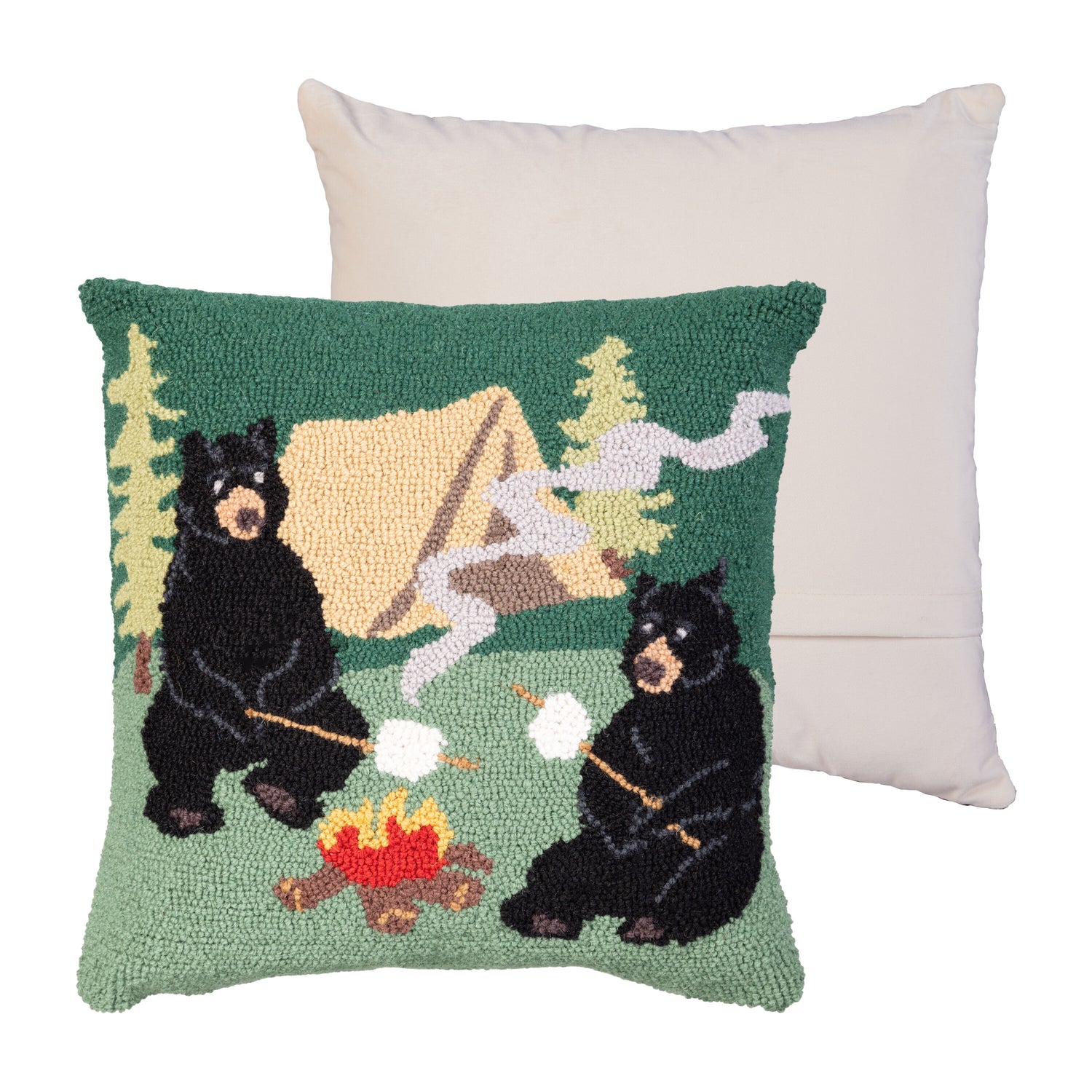 Featuring two black bears roasting marshmallows by the fire with a tent and pine trees in the background, this handcrafted hooked pillow is perfect for bringing warmth and personality to your sofa, bed, or favorite reading nook. Made with a wool/polyester on the front and backed with soft velveteen, it’s both playful and plush.