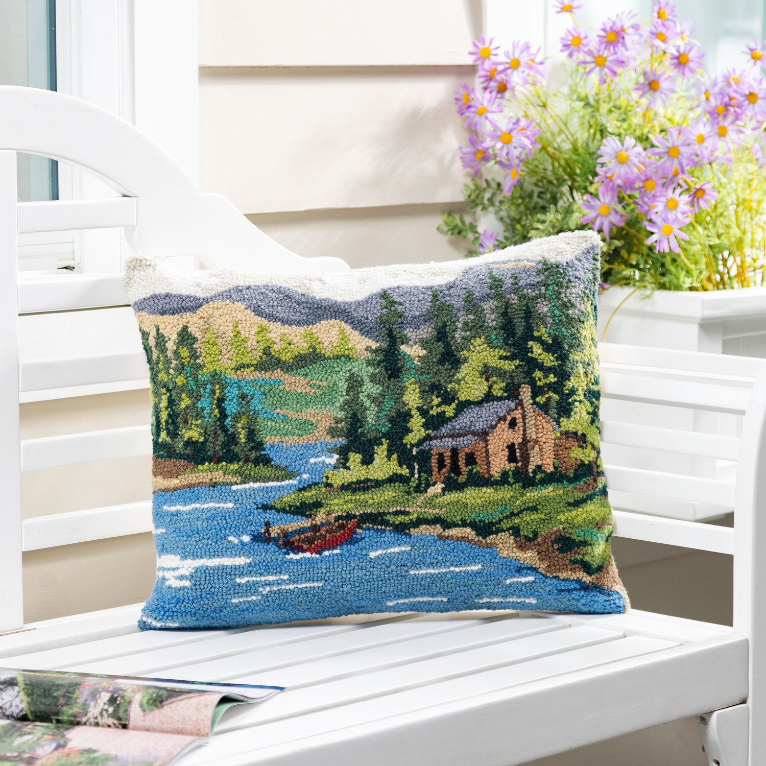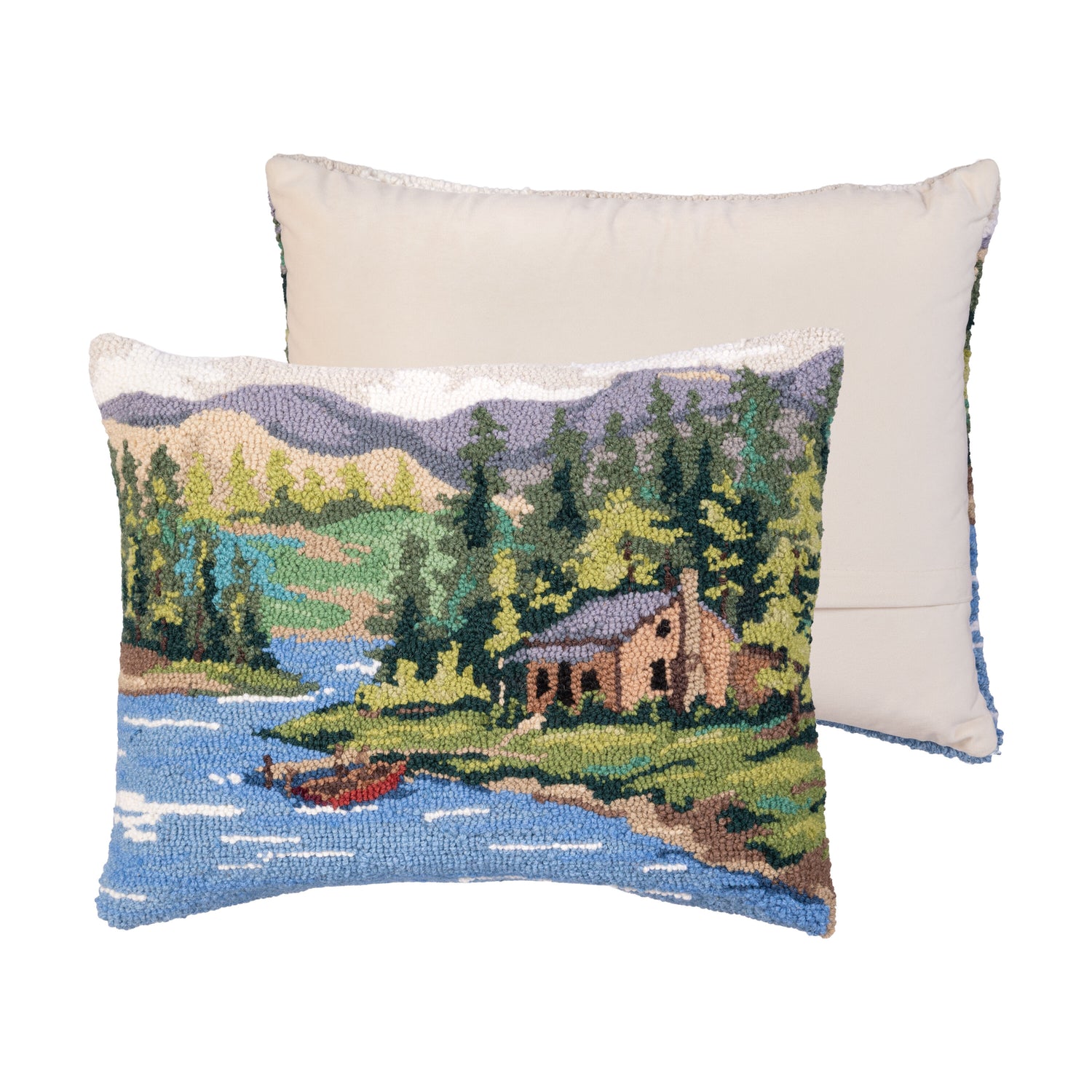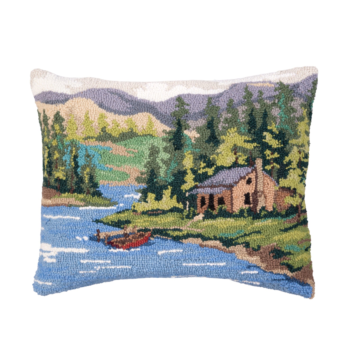 Bring the peaceful beauty of the great outdoors into your home with this Cabin by the Lake Hooked Pillow.Featuring a charming woodland landscape—complete with a cozy lakeside cabin, winding river, towering evergreens, and a quiet canoe drifting across the water—this pillow captures the warmth and nostalgia of a serene retreat. The rich greens, calming blues, and earthy tones are artfully textured with a hand-hooked finish that adds dimension and artisan appeal.Perfect for cabins, lake houses, or anyone who dreams of mountain mornings and forest air, this pillow makes a cozy statement on a porch bench, reading nook, or favorite armchair.