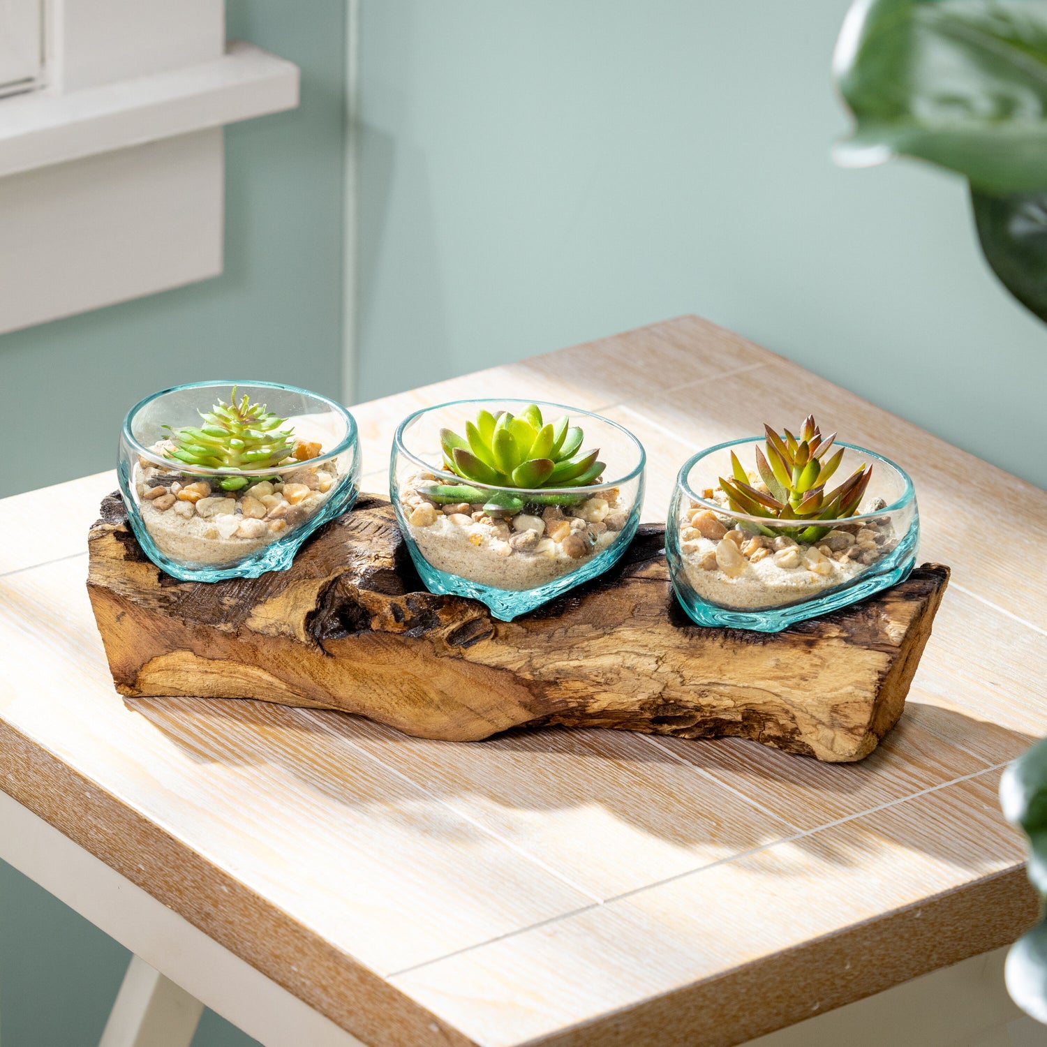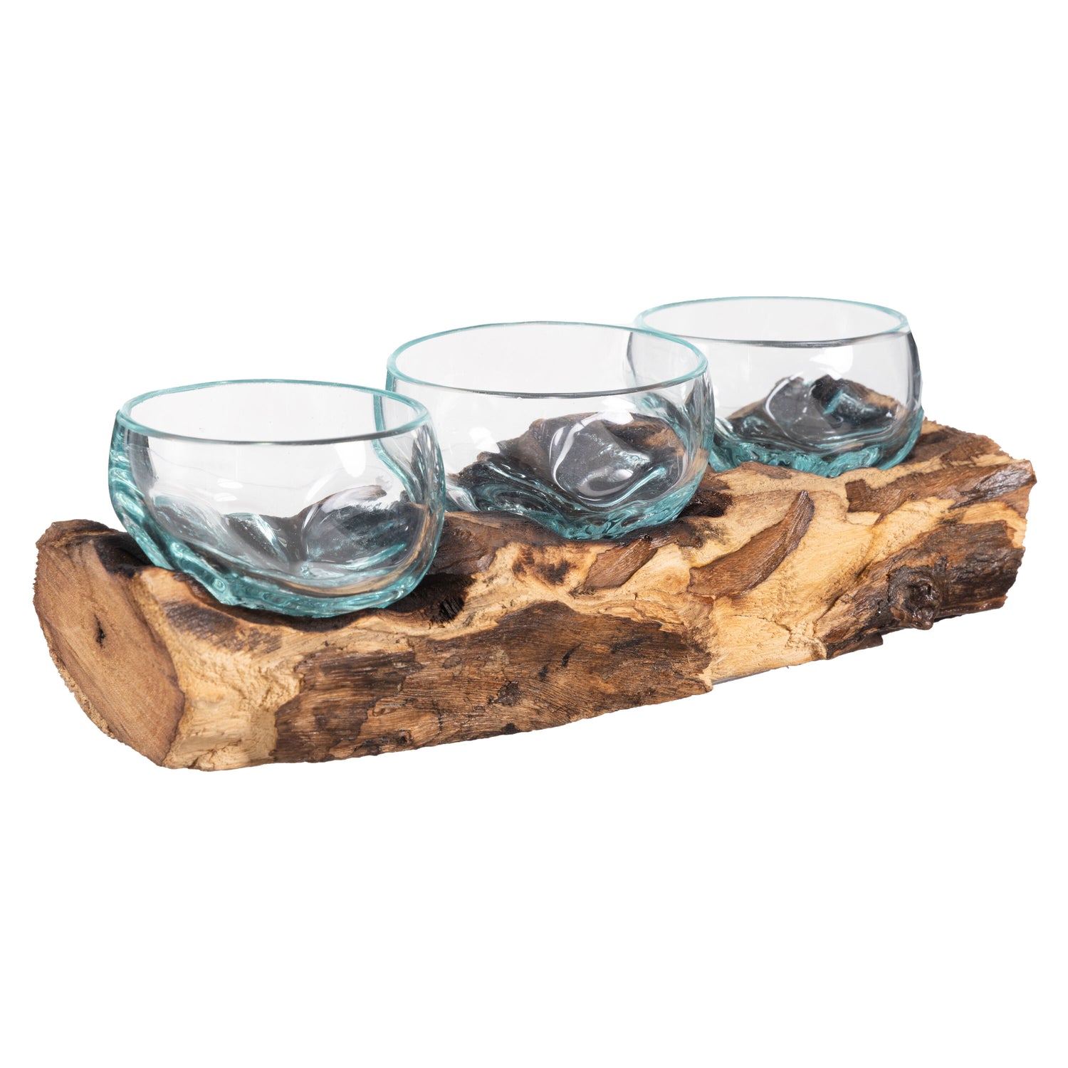 Each of the three recycled glass bowls is mouth-blown and shaped to nest perfectly into the contours of a reclaimed driftwood slab, resulting in a unique, sculptural statement. Use it as a serving piece, a centerpiece, or to showcase air plants, succulents, or candles—every display becomes a work of art.
