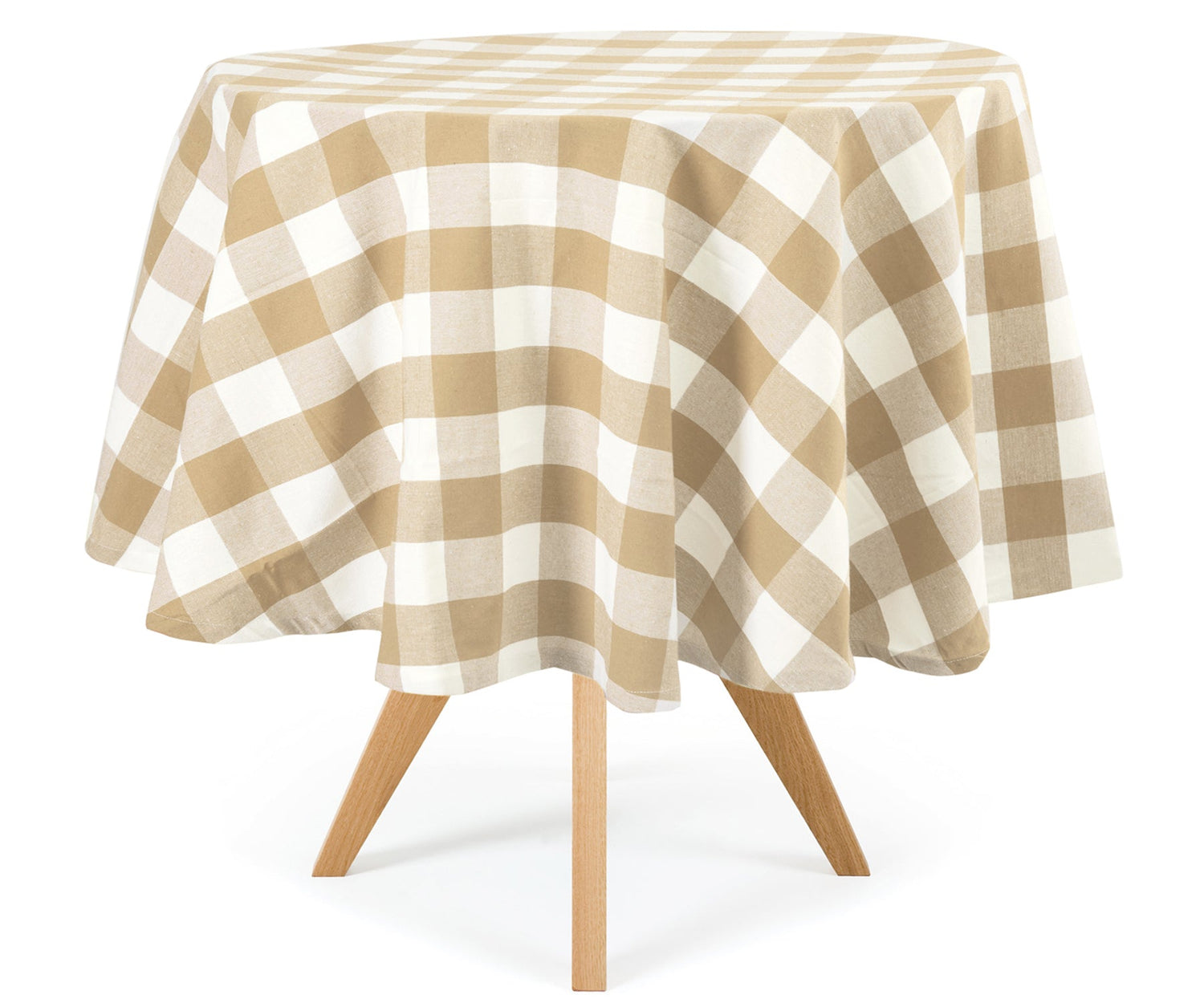 Crafted from 100% premium cotton, this beige round tablecloth features a soft beige and cream checkered pattern that exudes warmth and elegance. The neutral tones make it versatile — blending beautifully with rustic farmhouse, bohemian, or modern dining spaces.