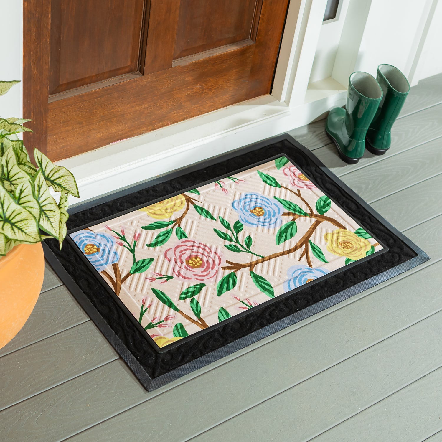 Sweep guests off their feet with our beautifully made embossed mats! Made with bright pops of color that are perfect for the season, this mat will put pep in anyone's step. Evergreen's embossed mats are crafted from outdoor-safe polypropylene and feature a rubber anti-slip backing. The embossed texture makes this mat more effective in trapping dirt, perfect for indoor or outdoor use. Place it in a high-traffic area to keep debris out of the home.