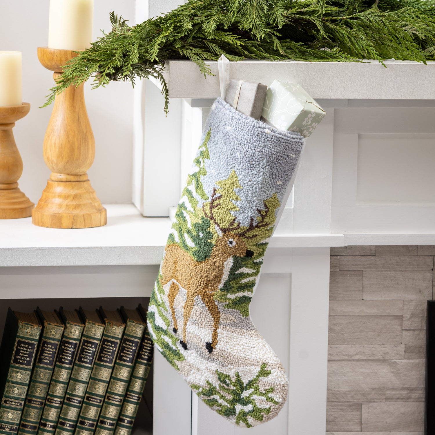 - Hand-hooked polypropylene stocking with a serene deer and forest scene