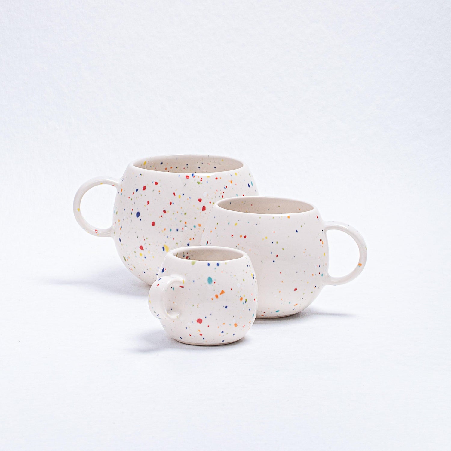 Our Party Collection features a special type of glaze that may exhibit areas where speckles become diffused due to the glass's reactive nature during processing. We find these unique, unpredictable variations to be the most beautiful aspect of the glaze.