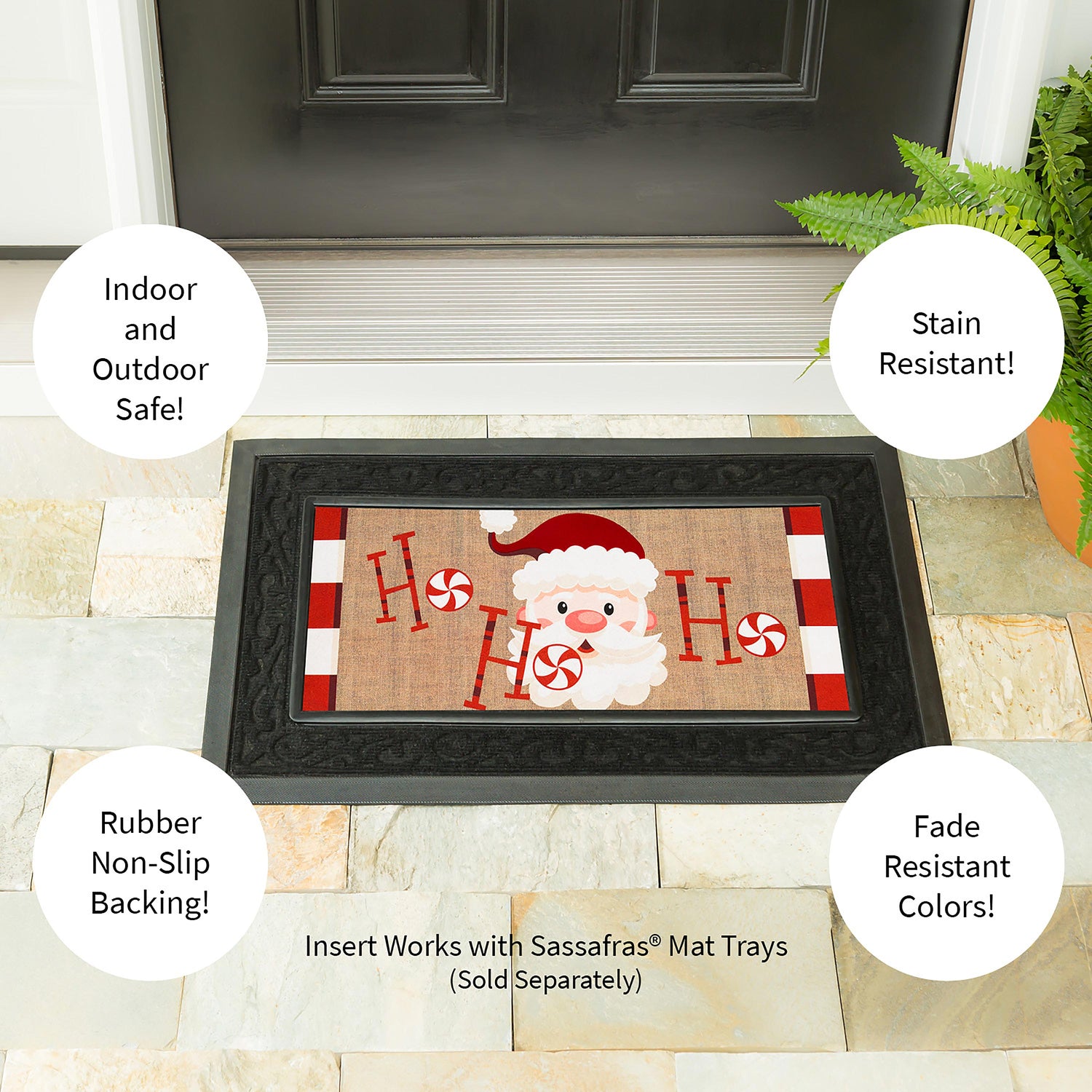 Dress up your entry way to reflect your unique style and welcome guests to your home. This mat features jolly ole Saint Nick and candy cane stripe details and makes a warm and welcoming statement to greet friends and family with a "HO HO HO". A stylish way to adorn your home to celebrate the season.