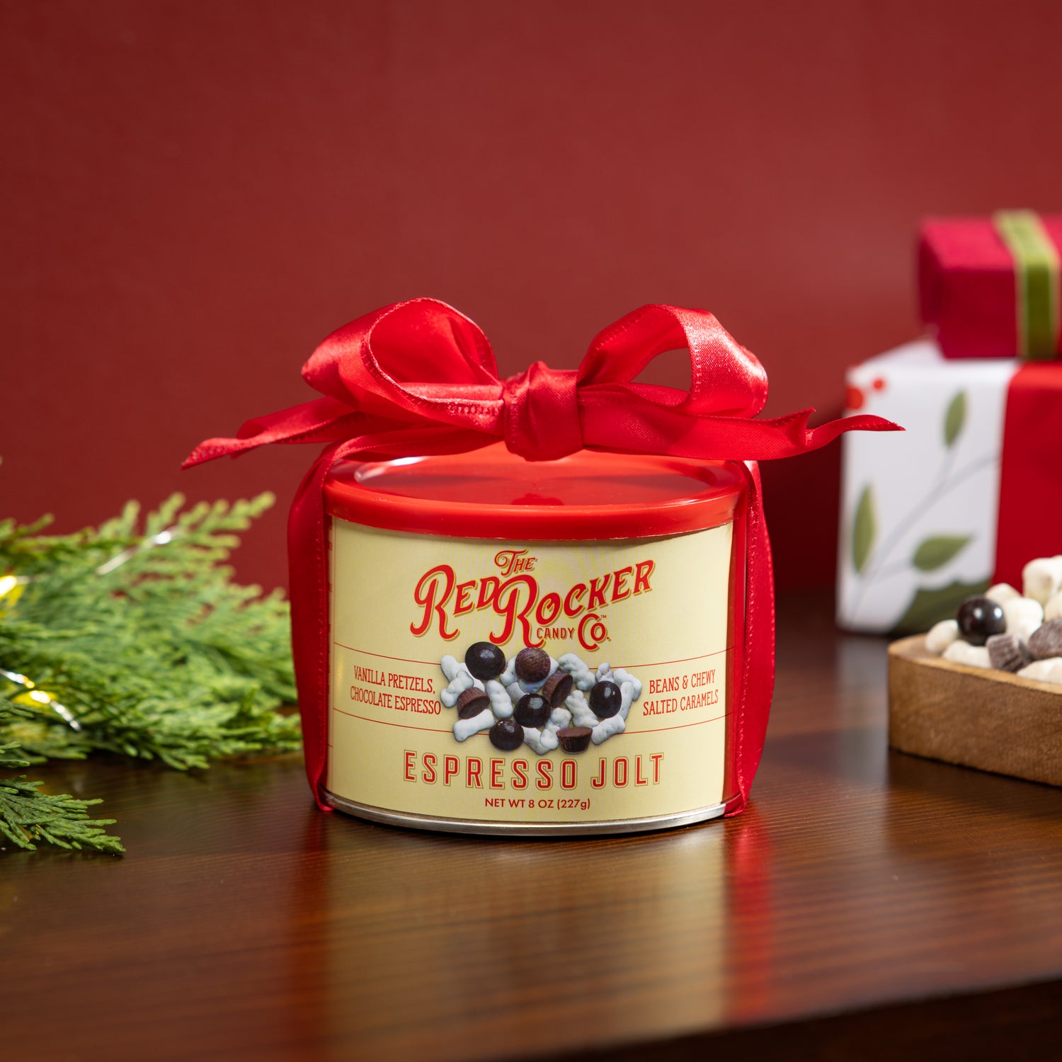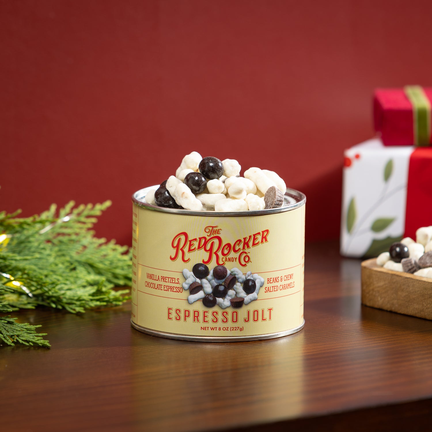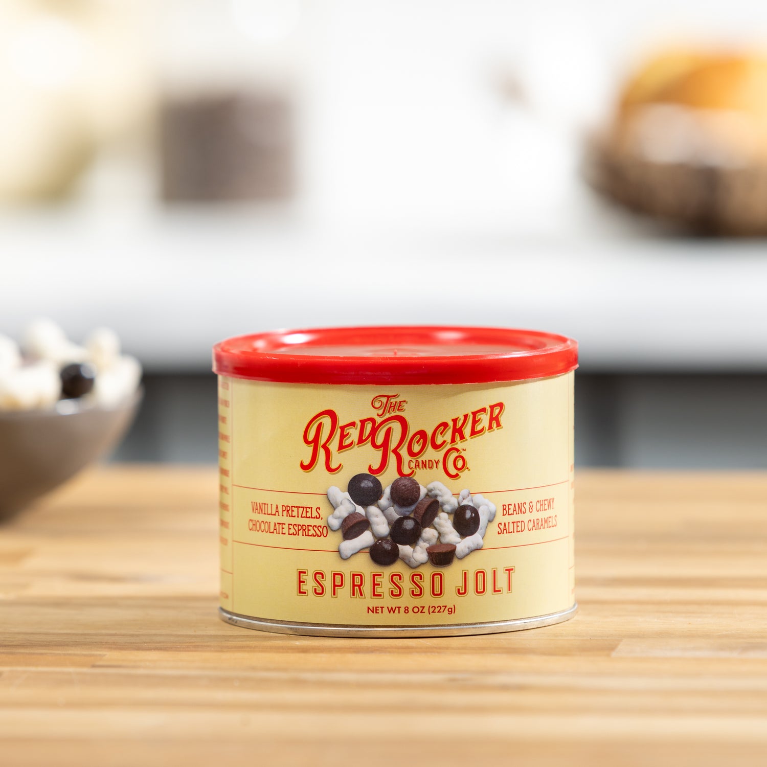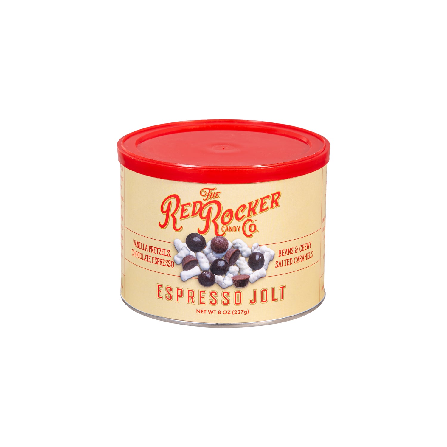 Wake up your taste buds with a bold, buzz-worthy treat: Espresso Jolt from The Red Rocker Candy Co. This energizing mix is the perfect pick-me-up, packed with rich chocolate espresso beans, vanilla-coated pretzels, salted caramels, and chocolatey bites that bring a delicious jolt of flavor to every handful.