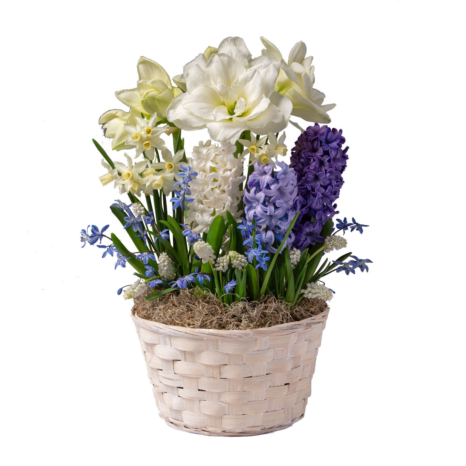 Nestled in a whitewashed woven basket, this living display features a delightful mix of premium spring flowers—such as white amaryllis, hyacinths, daffodils, and grape hyacinths—in soft tones of ivory, lavender, and violet. As each bloom unfolds, it brings the joy of the garden indoors with vibrant color and natural fragrance.