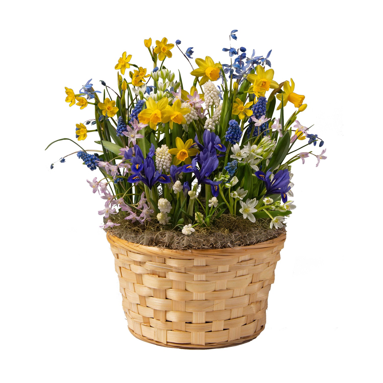 Planted with a curated mix of blooming bulbs—such as daffodils, grape hyacinths, irises, and other springtime favorites—this living arrangement arrives nestled in a natural woven basket and ready to grow. As the flowers emerge and unfurl, you'll enjoy the uplifting beauty and sweet fragrance of a garden in full bloom.