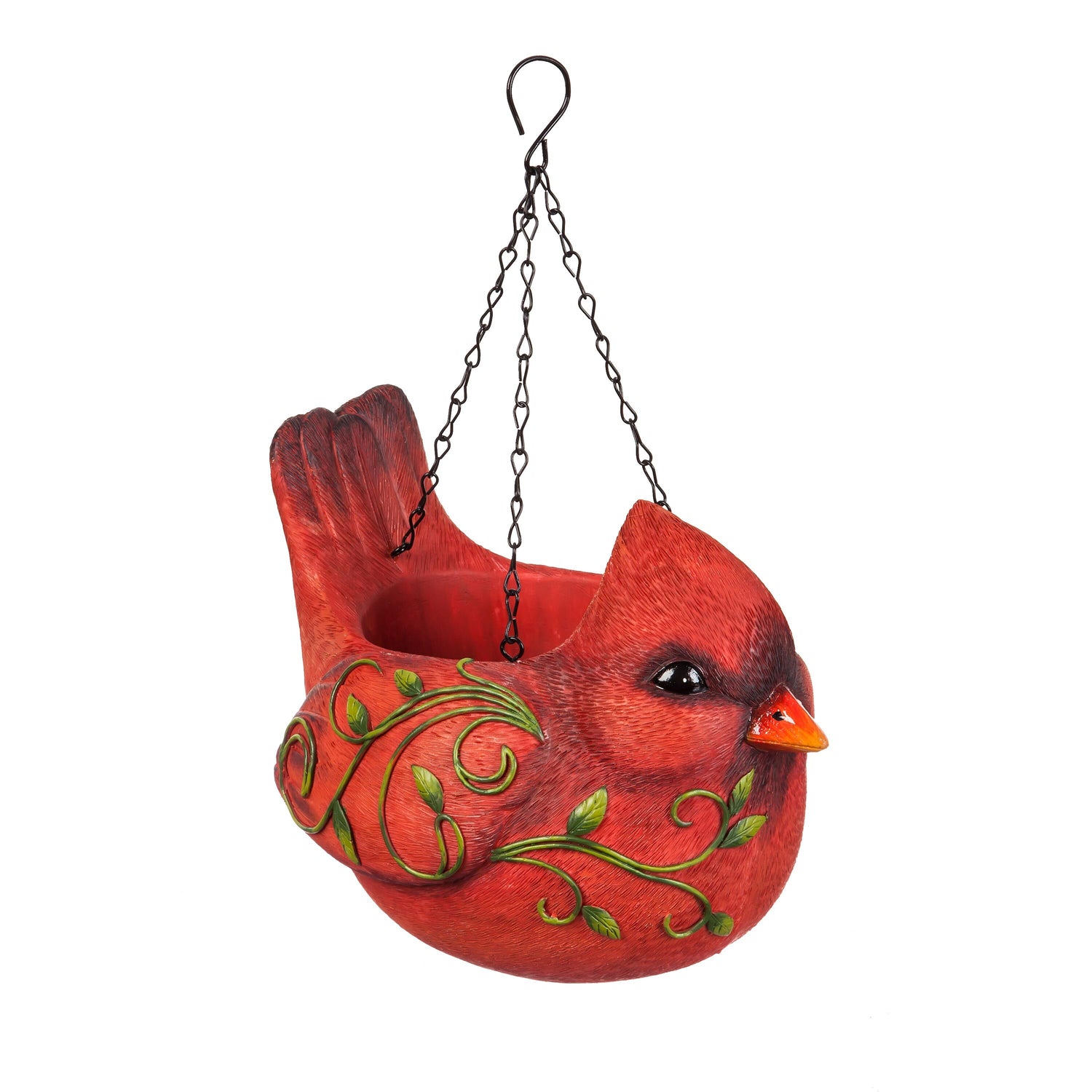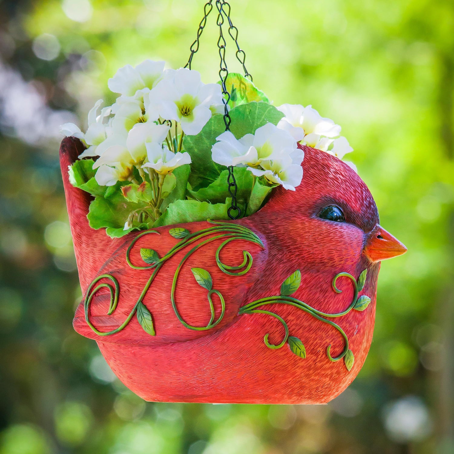 Elevate your small plants with this Hanging Portly Bird Planter. This planter features a charming red cardinal design with painted details. Display is made easy with the attached chain and hook. This functional and stylish decor is ideal for showcasing small flowers and plants on your porch, patio, or in any decorative space. Made of polyresin, this piece has a handcrafted appeal, while its weather-resistant materials make it safe for continued use.