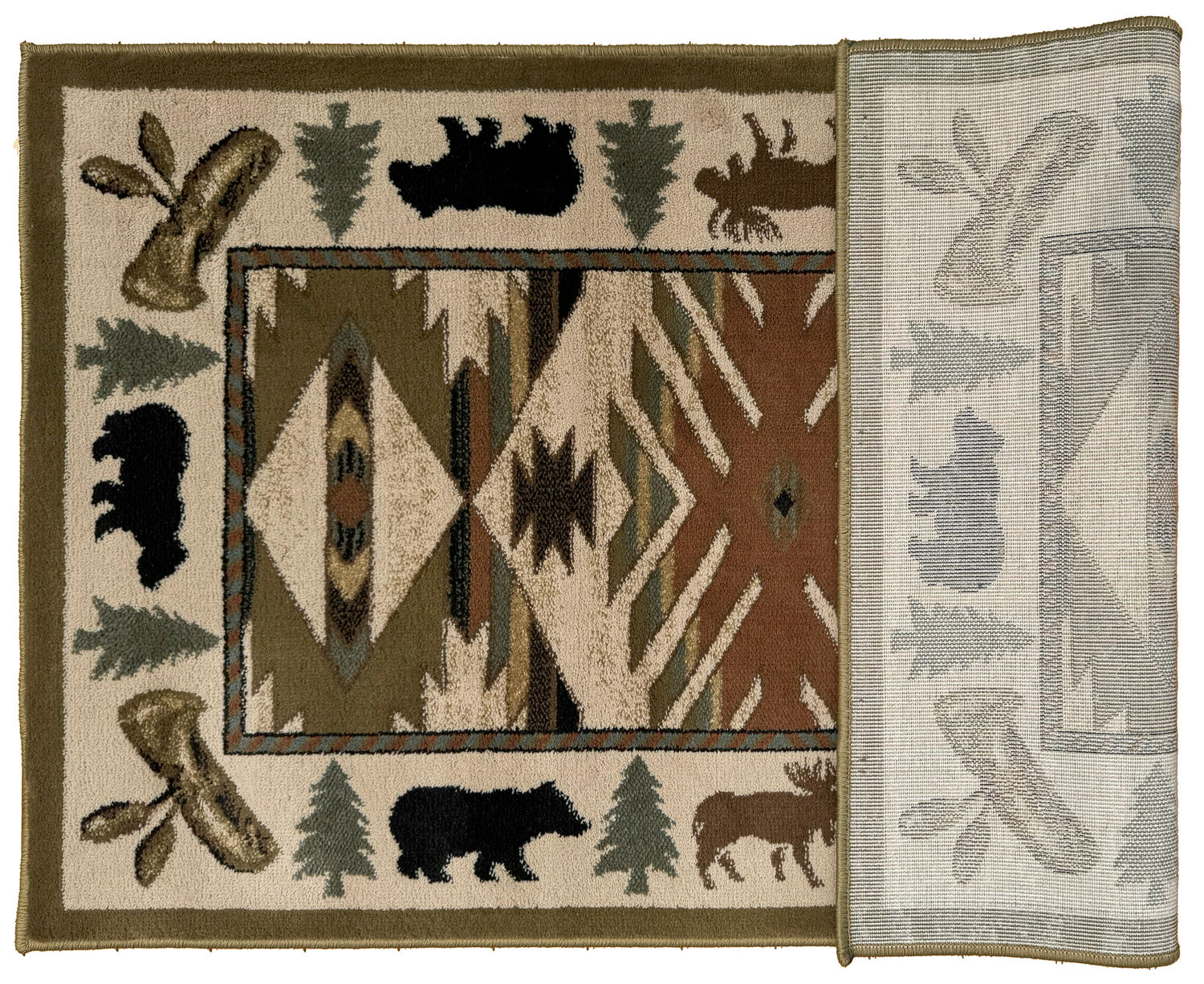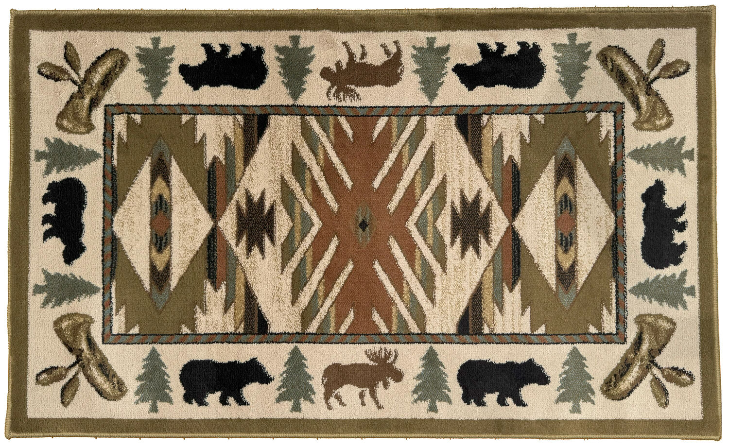 Bring the warmth and comfort of our Vista Bear & Moose Rug into your home! This thick, heavy weight Olefin rug feels soft and luxurious underfoot while its unique mix of geometric and organic lines adds beauty and interest to any space. Equally complementary to a rustic lodge or cabin and a modern home, this rug's classic hues blend flawlessly with most decorative styles and color palettes. Crafted of durable, stain-resistant, flame-resistant Olefin fiber, this rug offers a perfect option for high-traffic areas and by your hearth or wood stove. The generous size of this rug covers and protects a wide area. Its serged edges offer additional durability to keep it looking great for years to come. Can be used outdoors, too!